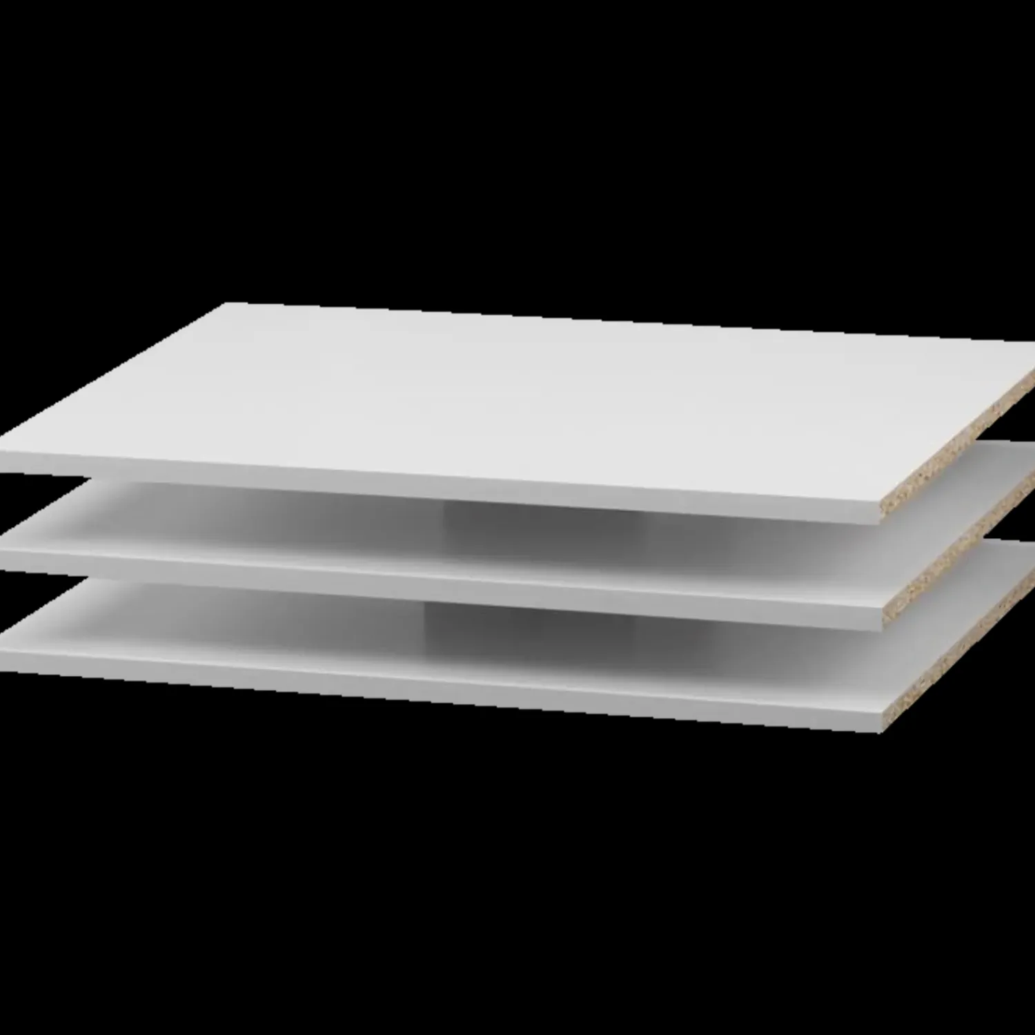 Hyldepakke med 3 hylder, samt hyldebærere i metal. Hylderne er i hvid melamin på under- og overdel, med ABS forkant
