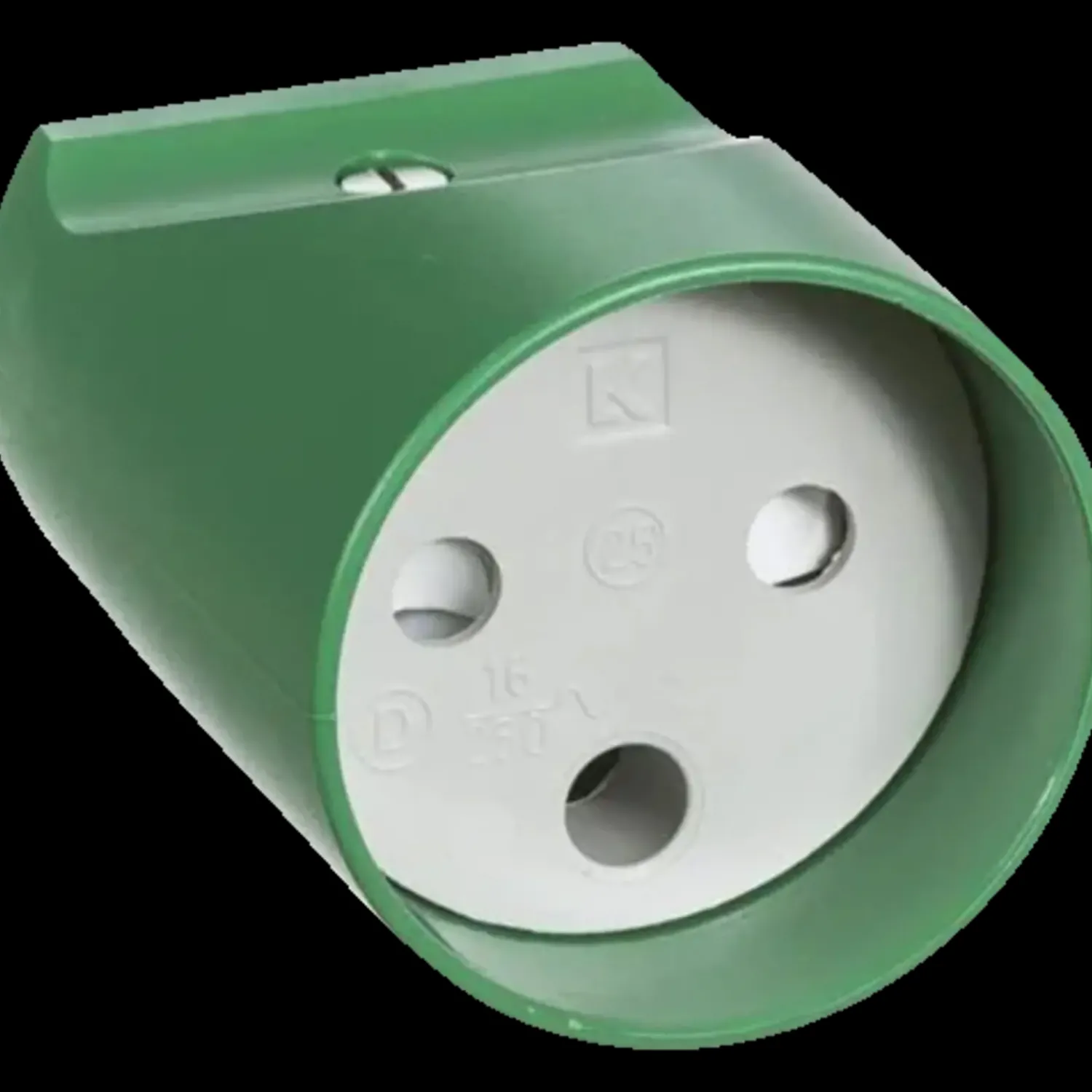 Rundt hunstik, uden jord til kabelsæt og forlængerledninger. Passer til runde og flade hanstik. Er monteret med isoleret aflastningsbøjle for kabel Ø2,5-10,5 mm. Brudsikker grøn plast.