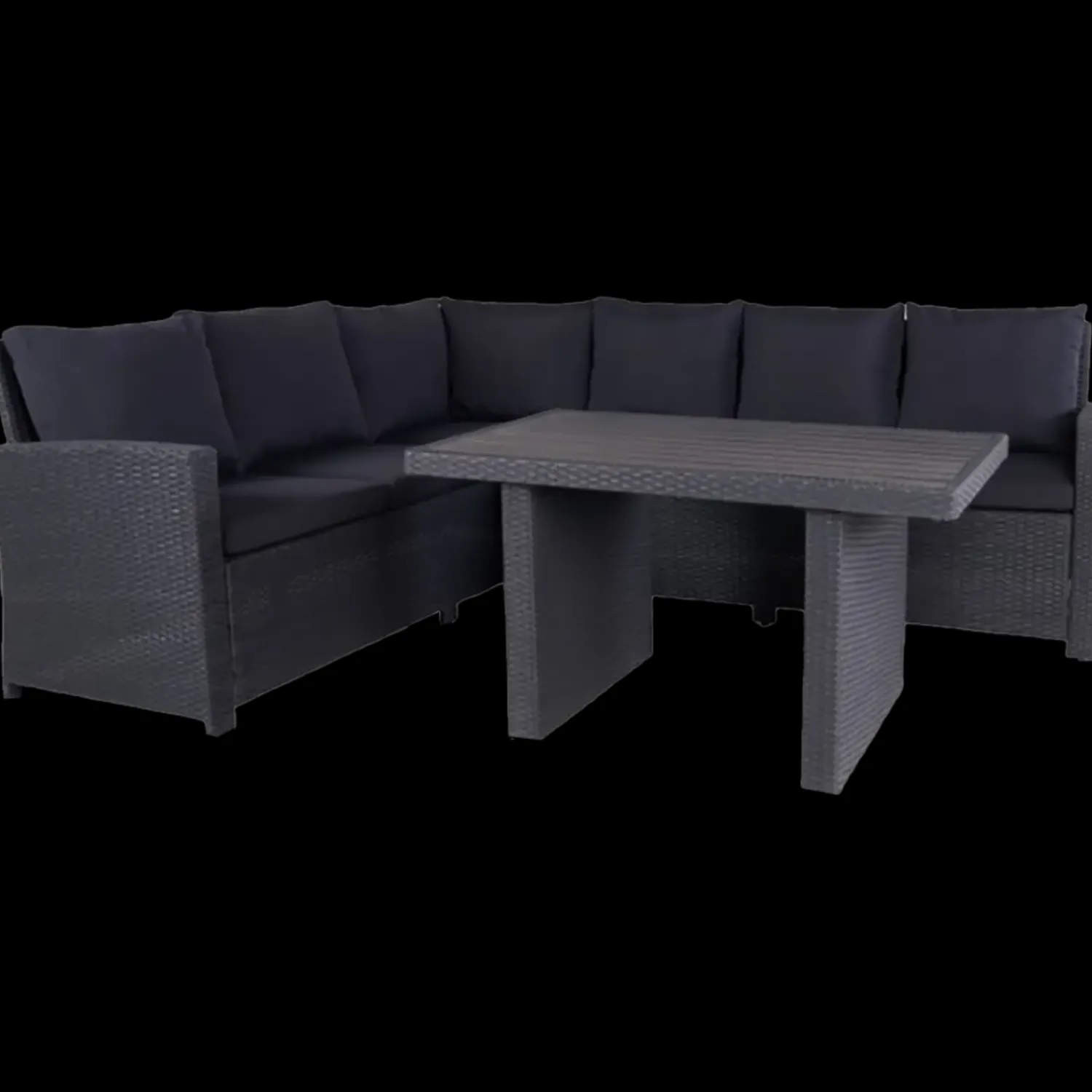 Her kan du flytte stuen ud i haven. Udendørsæt bestående af sofabord og stor hjørnesofa.Hjørnesofaen er fremstillet i vejrbestandig og holdbar sort, børstet PE-flet. at gøre, der nemt at holde og gøre rent. En opvredet klud er ofte tilstrækkeligNonwood bord i sort , børstet PE-flet, der ligeledes er holdbar og let at vedligholde.