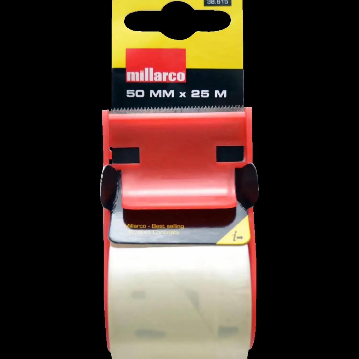 Tape med dispenser til forsegling eller styrkelse af papkasser, kartoner mv.Mål på dispenser: 12,8 x 5,8 x 6 cm.Tape b…