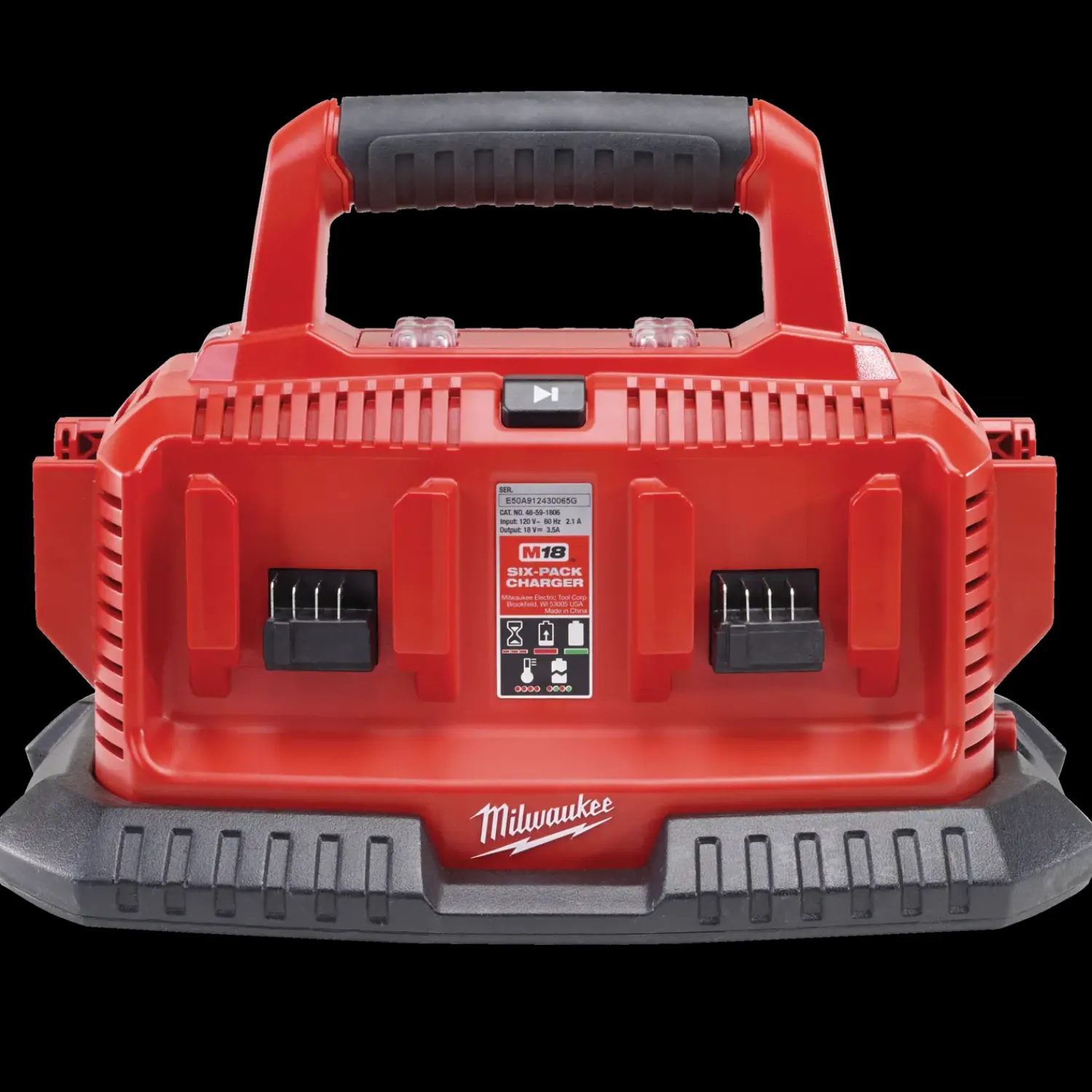 Praktisk multi oplader til Milwaukee batterier, der kan rumme op til 6 M18TM batterier samtidigt. Der er et praktisk “spring over” knap, så man nemt kan vælge hvilket batteri der skal oplades først. Der er huller i den, så den er mulig at hænge lodret op på f.eks. en væg i værkstedet eller i firmabilen.