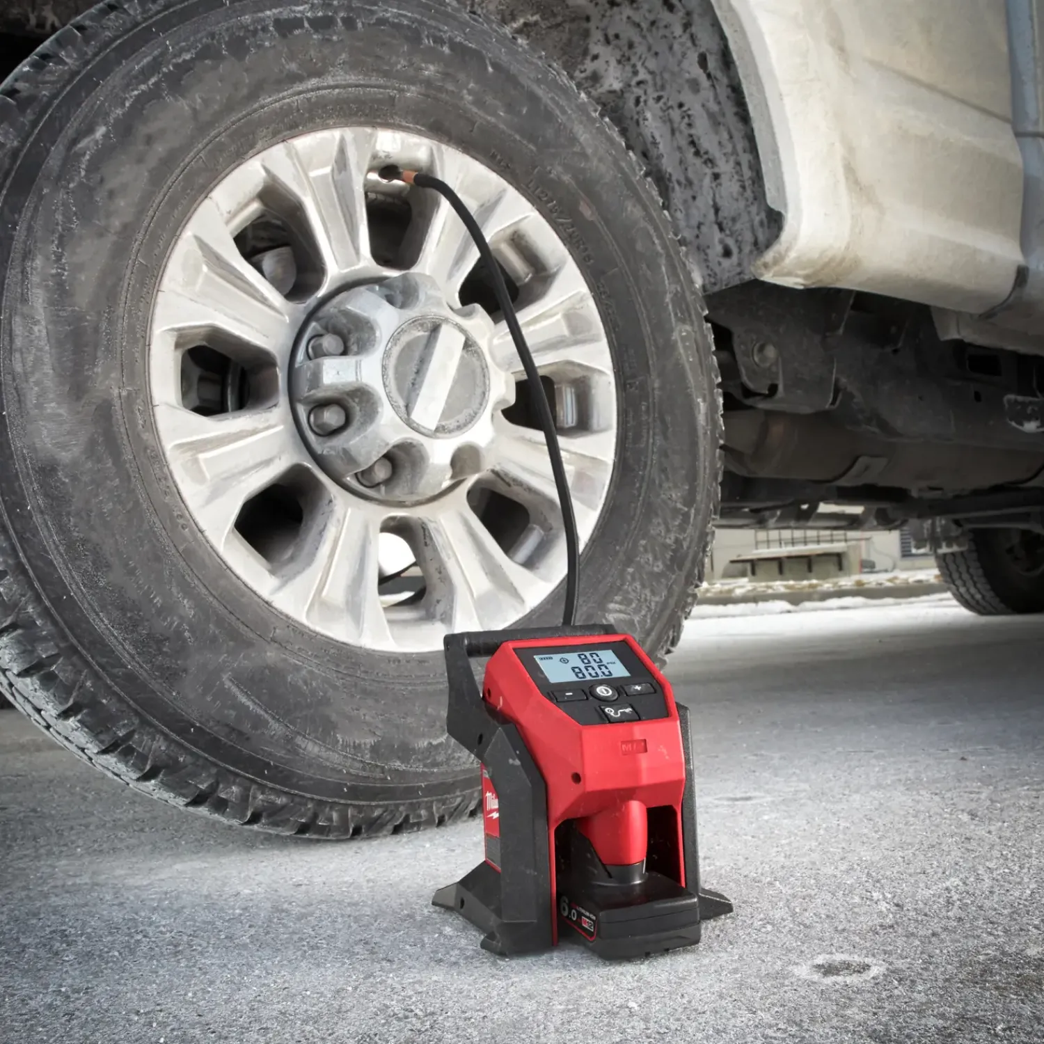 Højeffektiv luftpumpe kompatibel med M12 batterier fra Milwaukee, hurtig oppumpning af dæk på biler, trillebører, sækkevogne, luftmadrasser og meget mere.