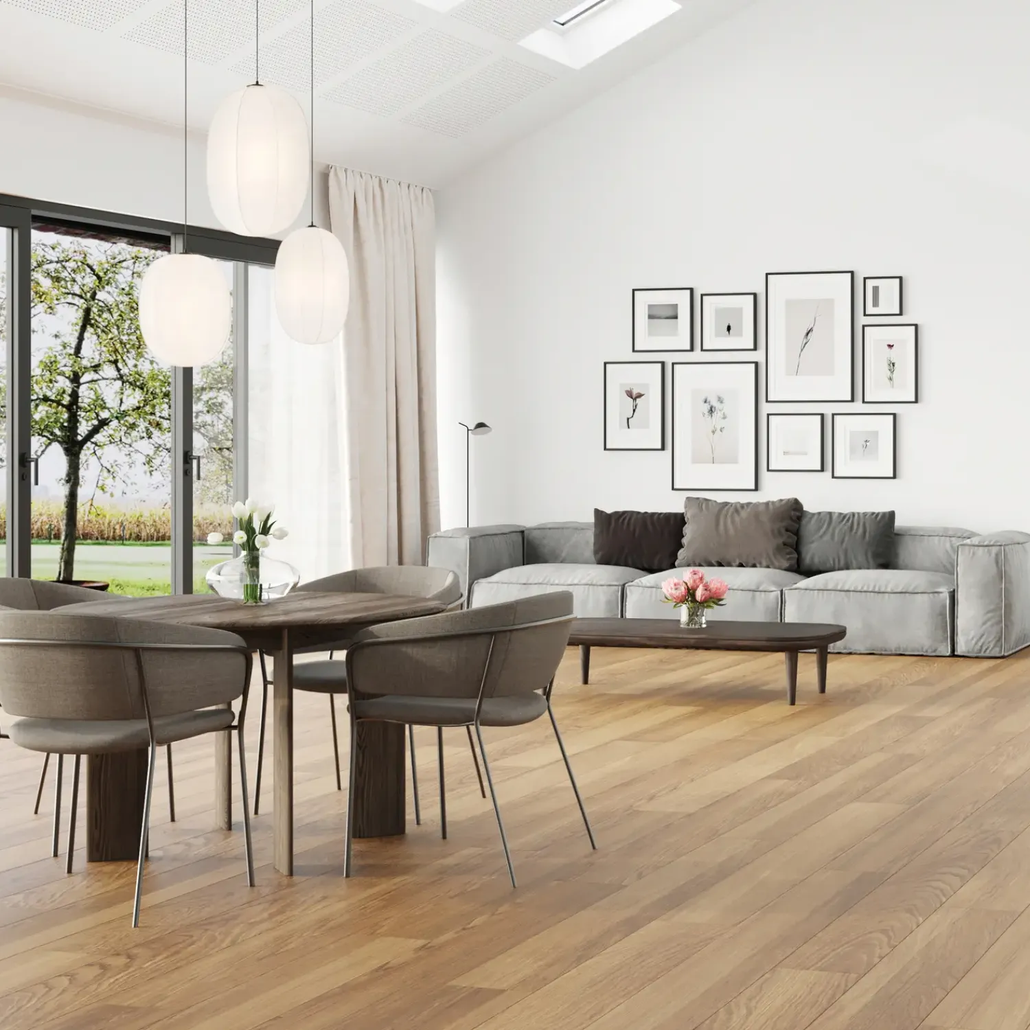 Gulvets bagside er forsynet med trinlydsdæmpende materiale, der reducerer støjen med op til 20 dB. Det bidrager til en fredfyldt og behagelig atmosfære i hjemmet, mens gulvet samtidig sikrer en gangkomfort, der harmonerer perfekt med det elegante design.