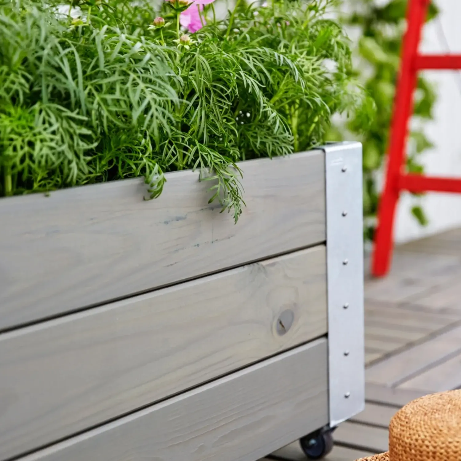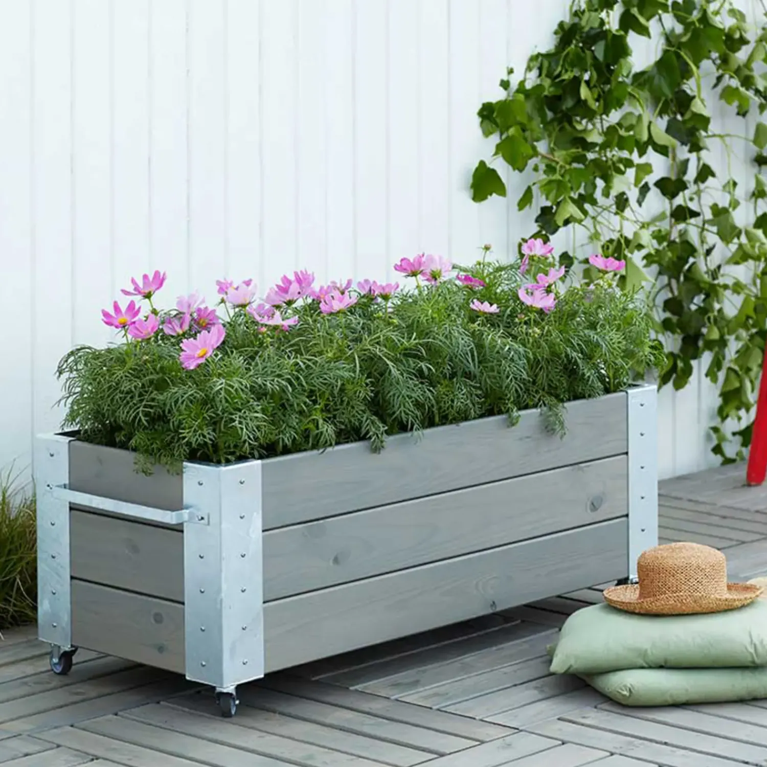 Kreer din egen oase på terrassen med blomsterkasser fyldt med smukke blomster eller lækre krydderurter. Med en blomsterkasse fra PLUS er der mulighed for at give terrassen helhed og et smukt udtryk. Stålhjørnerne på blomsterkassen er med til at give et flot og rustikt udtryk. Kasserne er med hjul, hvilket gør dem nemmere at flytte rundt på.