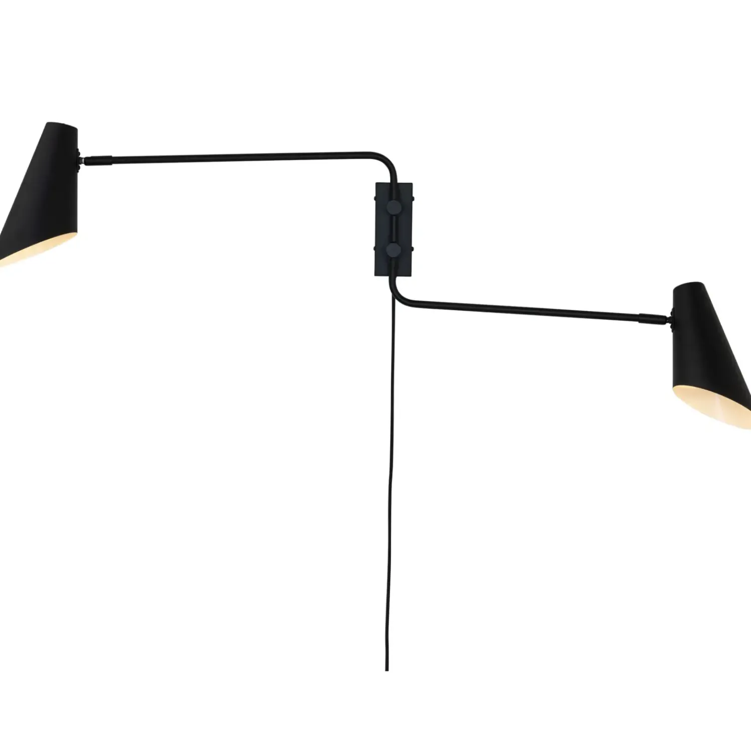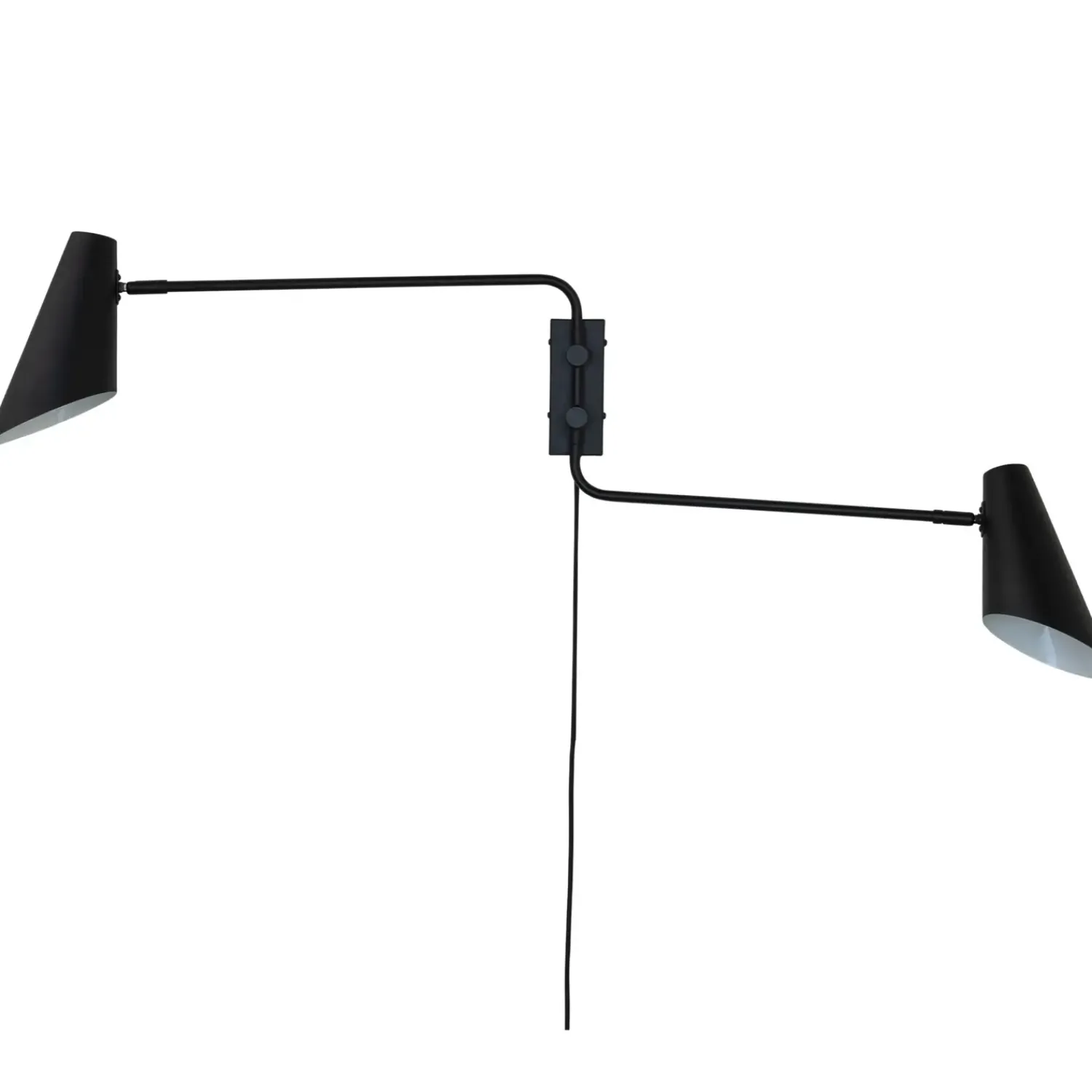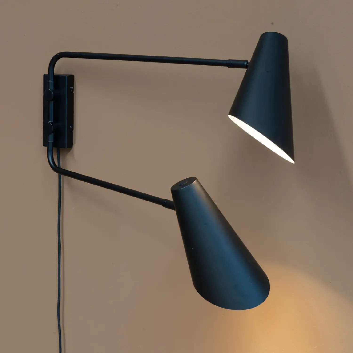 Den klassiske Cale serie bliver udvidet med denne væglampe, hvor begge arme kan justeres frem og tilbage. Hovedet kan drejes og vippes. Tænd og sluk sidder på skærmen. Lampens beslag på væggen er meget stabilt og robust og sikre en flot og stærk montering.