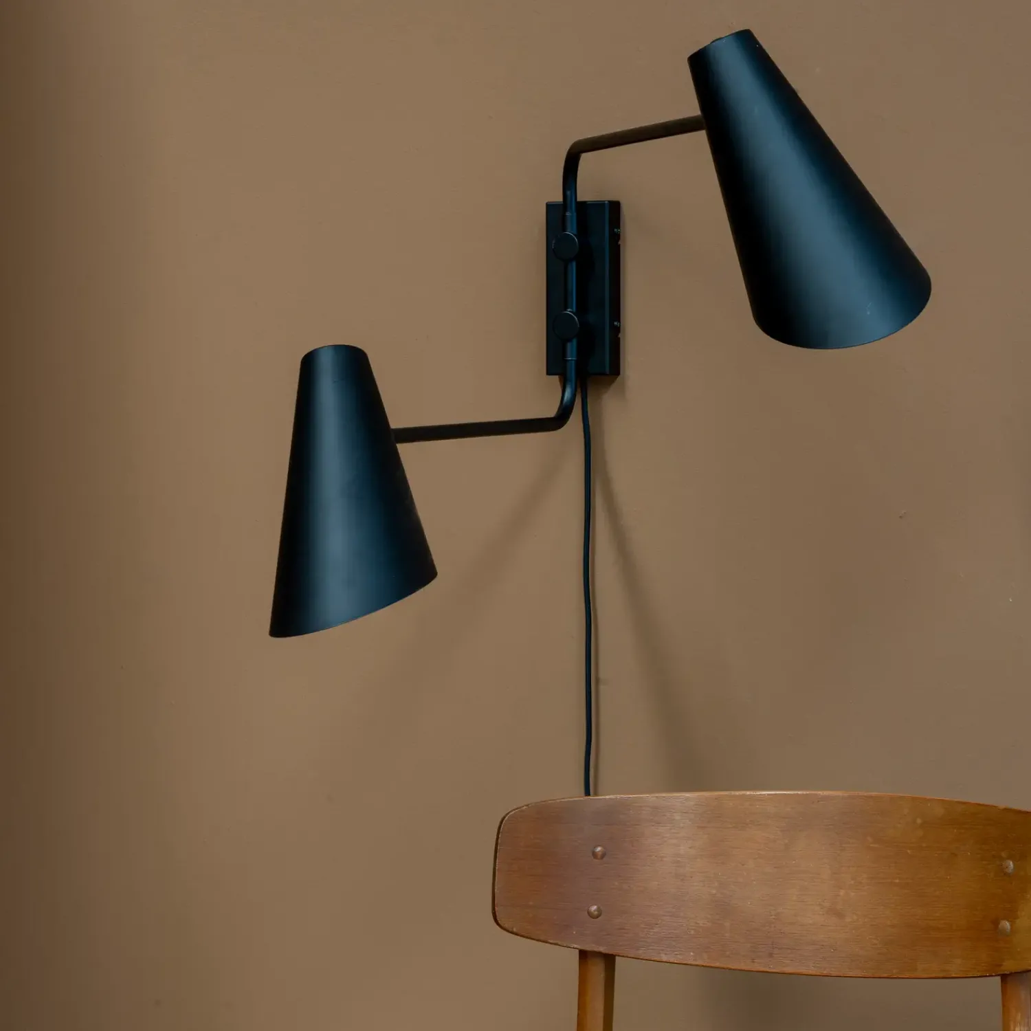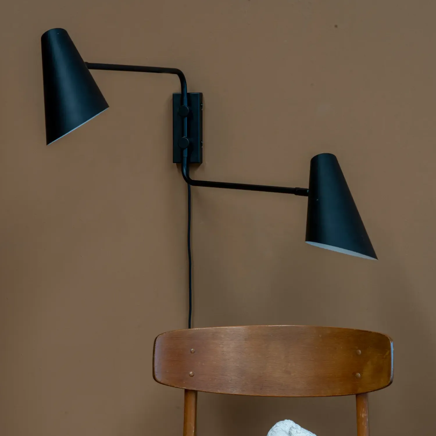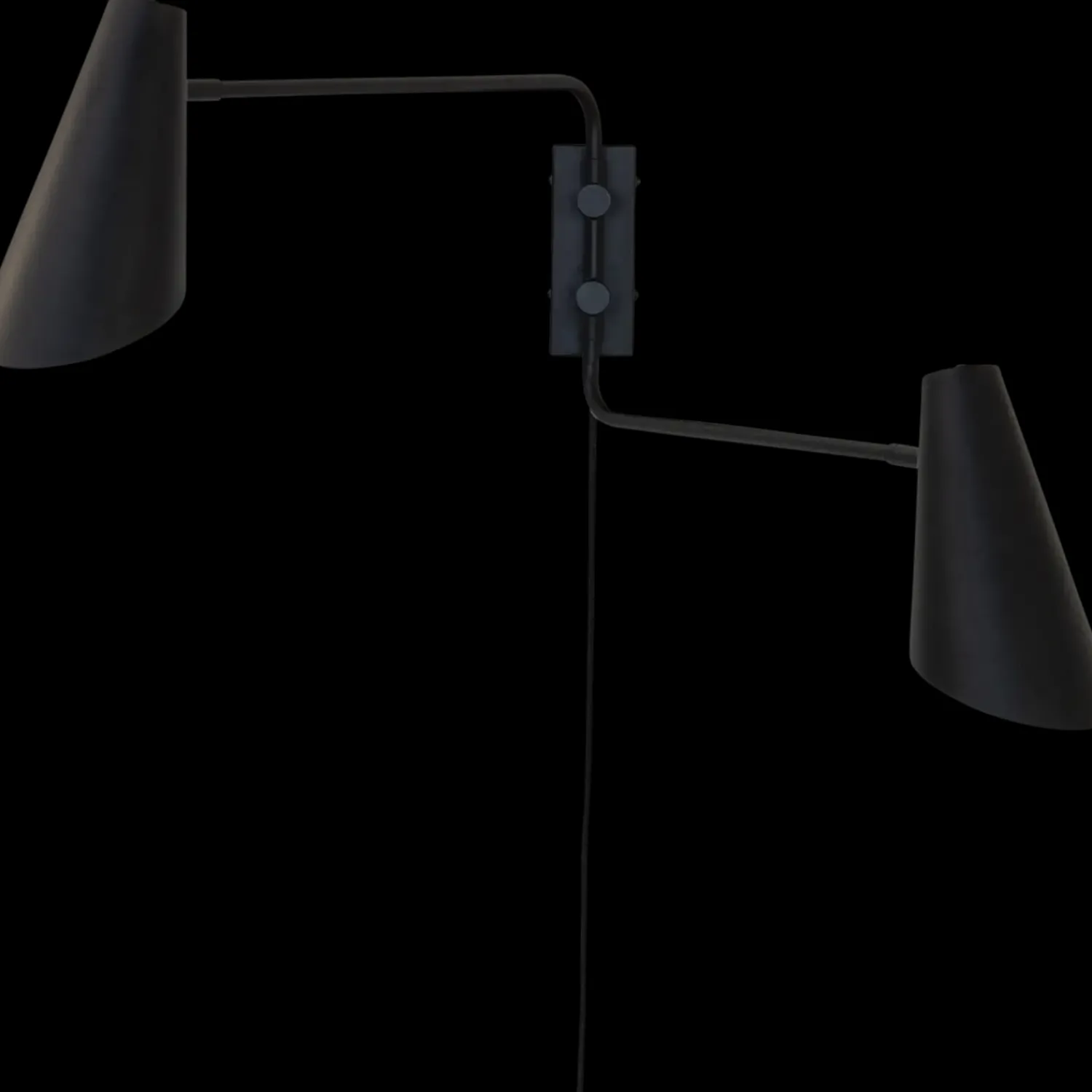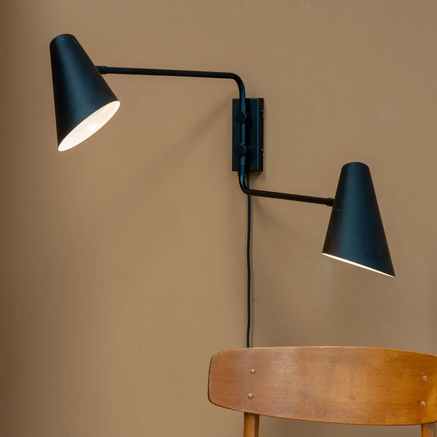Den klassiske Cale serie bliver udvidet med denne væglampe, hvor begge arme kan justeres frem og tilbage. Hovedet kan drejes og vippes. Tænd og sluk sidder på skærmen. Lampens beslag på væggen er meget stabilt og robust og sikre en flot og stærk montering.