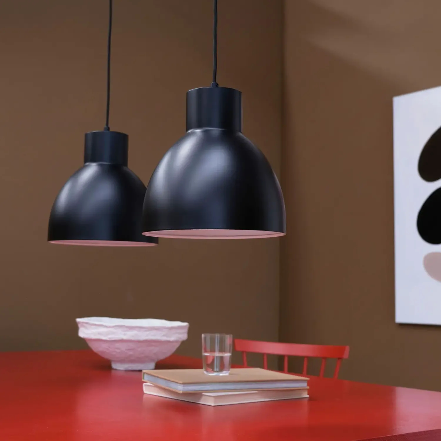 Coast pendel, enkelt og med ombukket kant. Serien er 2 størrelser. Metal loftroset.