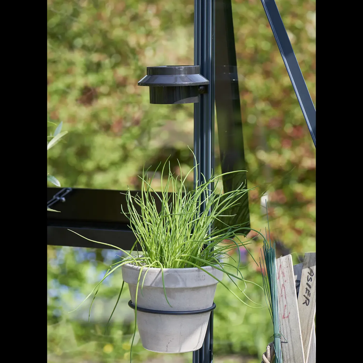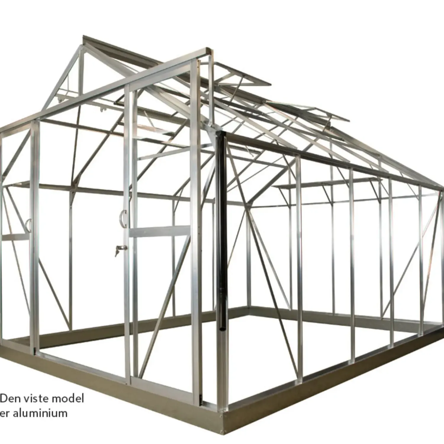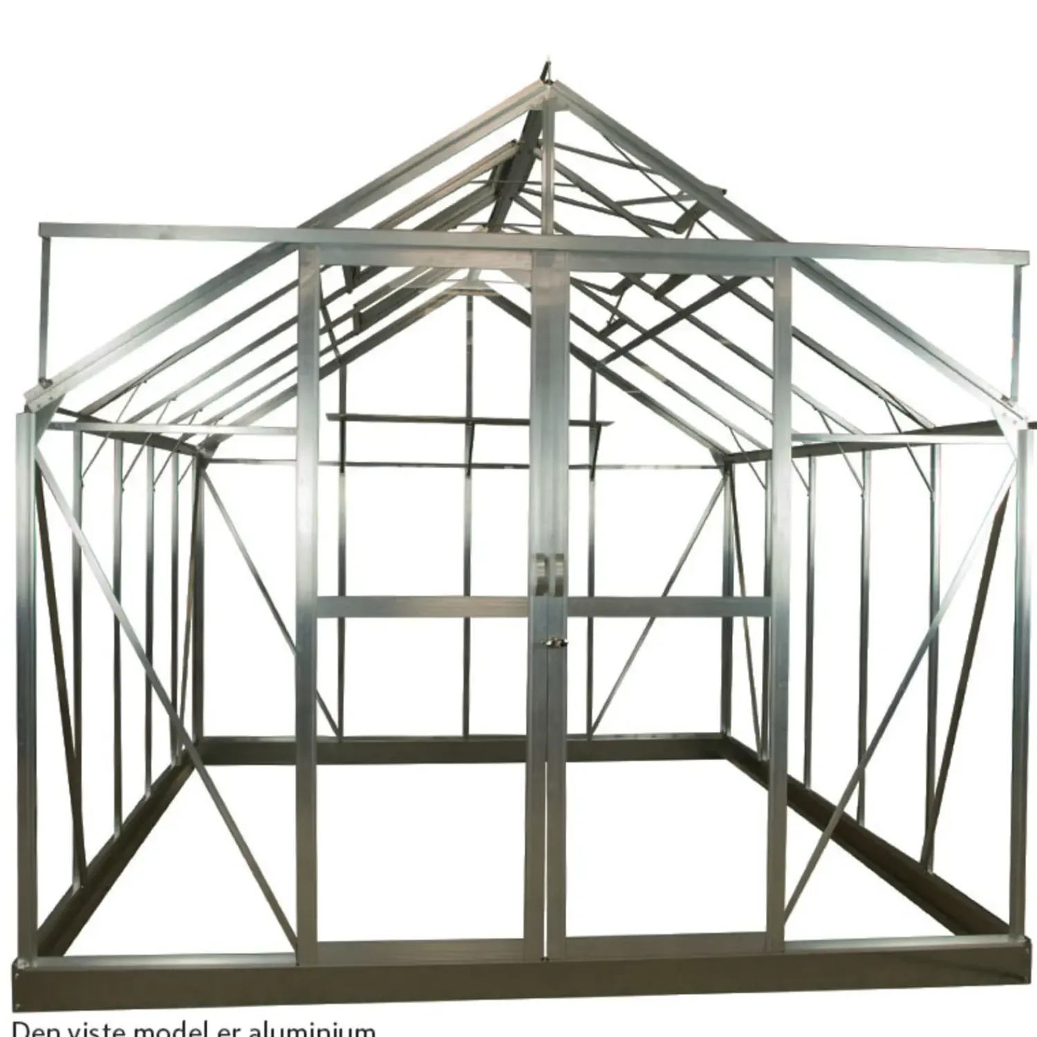 Drivhuset kommer med aluminium antracitprofiler og 3 mm hærdet glas i hele baner, der giver dig et fint og uforstyrret udsyn uden glassamlinger. Ligeledes leveres Standard drivhuset med galvaniseret stålfundament B272,4 x 424,8 cm, hvilket gør drivhuset 12 cm højere. Der er flere nedstøbningspunkter, og det anbefales at fundamentet nedstøbes i betonrør med stolpebeton. For at lette samlingen af drivhuset anbefales det, at du venter med at stramme skurerne til sidst.
