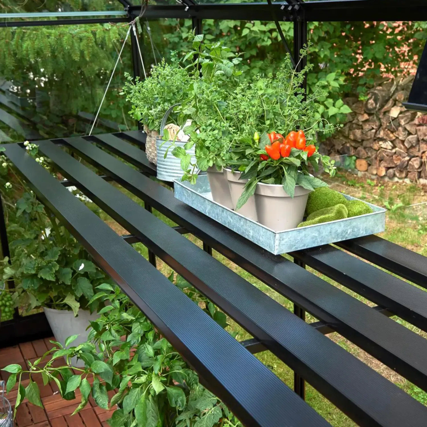 Har du brug for meget bordplads i dit drivhus, og vil du udnytte hele drivhusets længden, så er lamelbordet den rette løsning til dig. Bordet går fra gavl til gavl og udnytter således hel langsiden i drivhuset. Det monteres nemt i drivhusets profiler og består af seks baner med lameller i sort pulverlakeret aluminium, som fastgøres på afstivningsprofiler, der sidder i drivhusets tremmer.