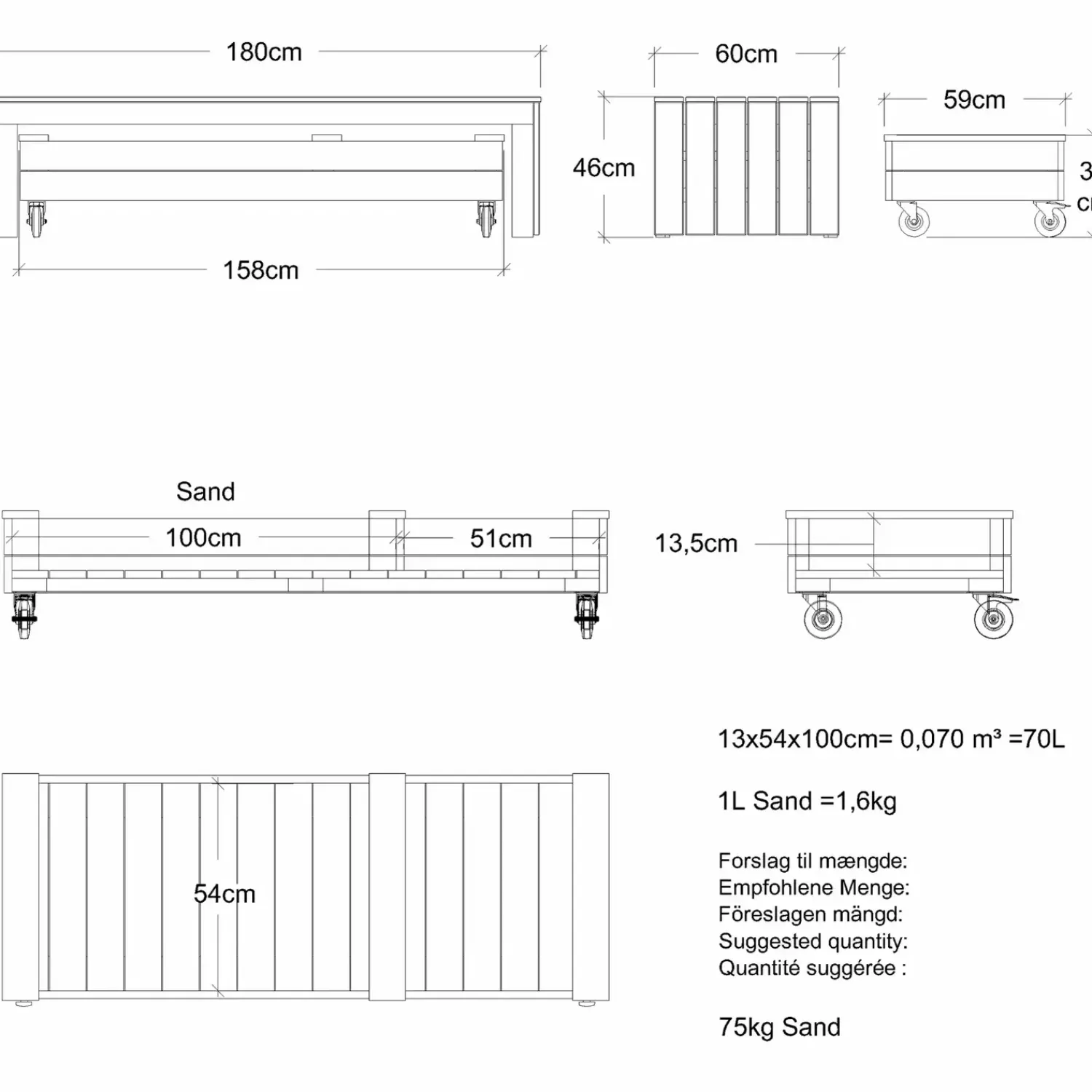 Fun sandkasse m/hjul og bænk – 180 cm – 18050-1Enkel og praktisk sandkasse med hjul, som nemt kan rulles inden under bænken og gemmes af vejen, når den ikke er i brug. Samtidig holdes sandet sikkert og rent.Bænken gør det behageligt for forældre at sidde og være en del af legen.I sandkassen er der også et lille rum til opbevaring af legetøj.Når børnene bliver for store til at bruge sandkassen, kan den i stedet bruges som plantekasse eller en mini køkkenhave.De store hjul gør det nemt at flytte kassen, selv når den er fyldt med sand, ting eller planter.Varenr. består af:Sandkasse med hjul og bænk samt fiberdug og skruer.Aldersgruppe:fra 1 år.Estimeret montagetid: 1 person – 2 timer.Sandkasse:Ubehandlet nåletræ.158×59 cm.Højde 33 cm (med hjul).Hjul Ø100 mm – 2 uden stop og 2 med stop (bremselås).Sand til sandkasse:Foreslået mængede = 47 ltr. (svarende til 75 kg).Indvendig højde 13,5 cm.Bænk:Ubehandlet nåletræ.180×60 cm.Siddehøjde 46 cm.Fibertex dug:Non-woven dug i polypropylen og polyester.160×150 cm.Dugen tilpasses.Leveres ubehandlet og som “Saml selv”.PLUS anbefaler altid grundbehandling inden opstilling.PLUS legereskaber er CE mærket – godkendt til privat brug.