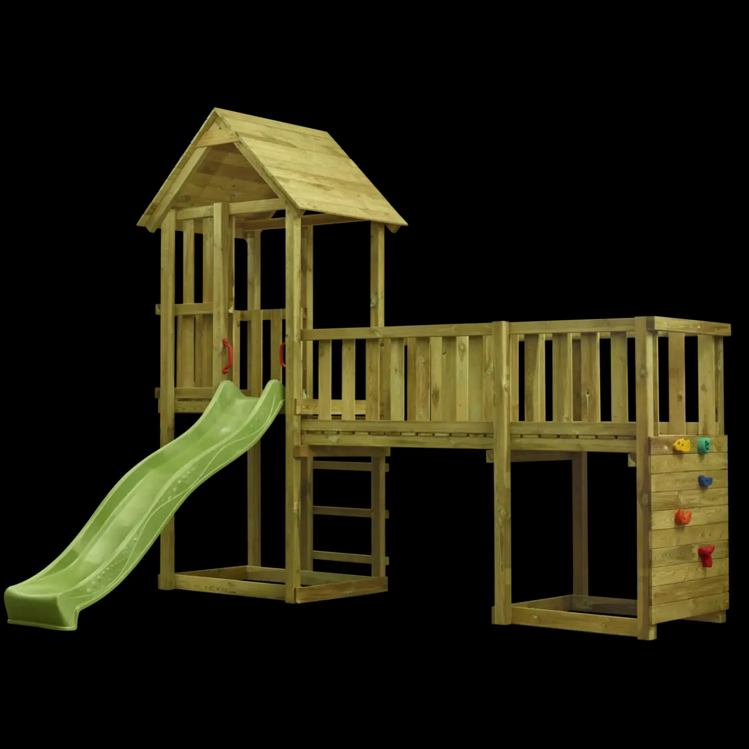 Plus legetårn er fremstillet i trykimprægneret gran i den velkendte kvalitet fra danske Plus. Her får du et legetårn i bedste kvalitet, som børnene vil have glæde af i mange år fremover, og hvor du trygt kan lade dem lege i timevis. Legetårnet er udstyret med stige op til platformen,hvorfra børnene kan tage den grønne rutchebane på nedturen og derefter tage en tur på gyngerne.