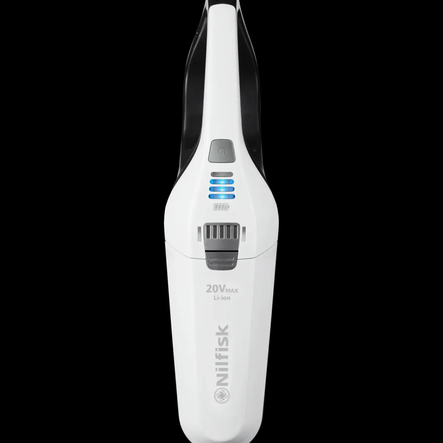 Lysindikatoren på Nilfisk Quick White håndstøvsugeren viser når støvsugeren oplader og hvilken batteristand den har ved brug. Den har op til 12 minutters driftstid ved fuld opladning. Håndstøvsugeren er designet med enkel og hygiejnisk tømning samt vaskbart filter.