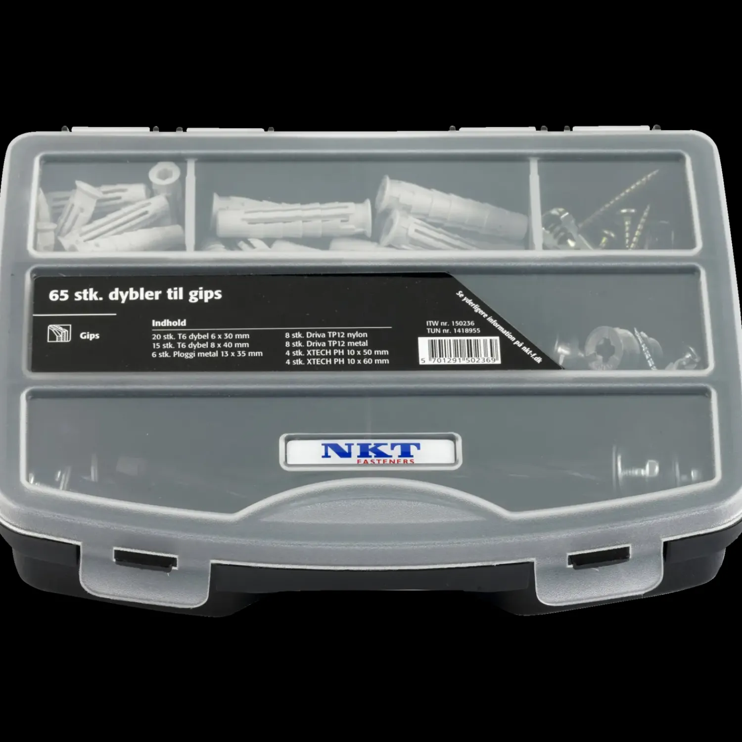 Med dette gips montage sortiment får du 65 dyvler til montering af tunge og lette emner i gips.