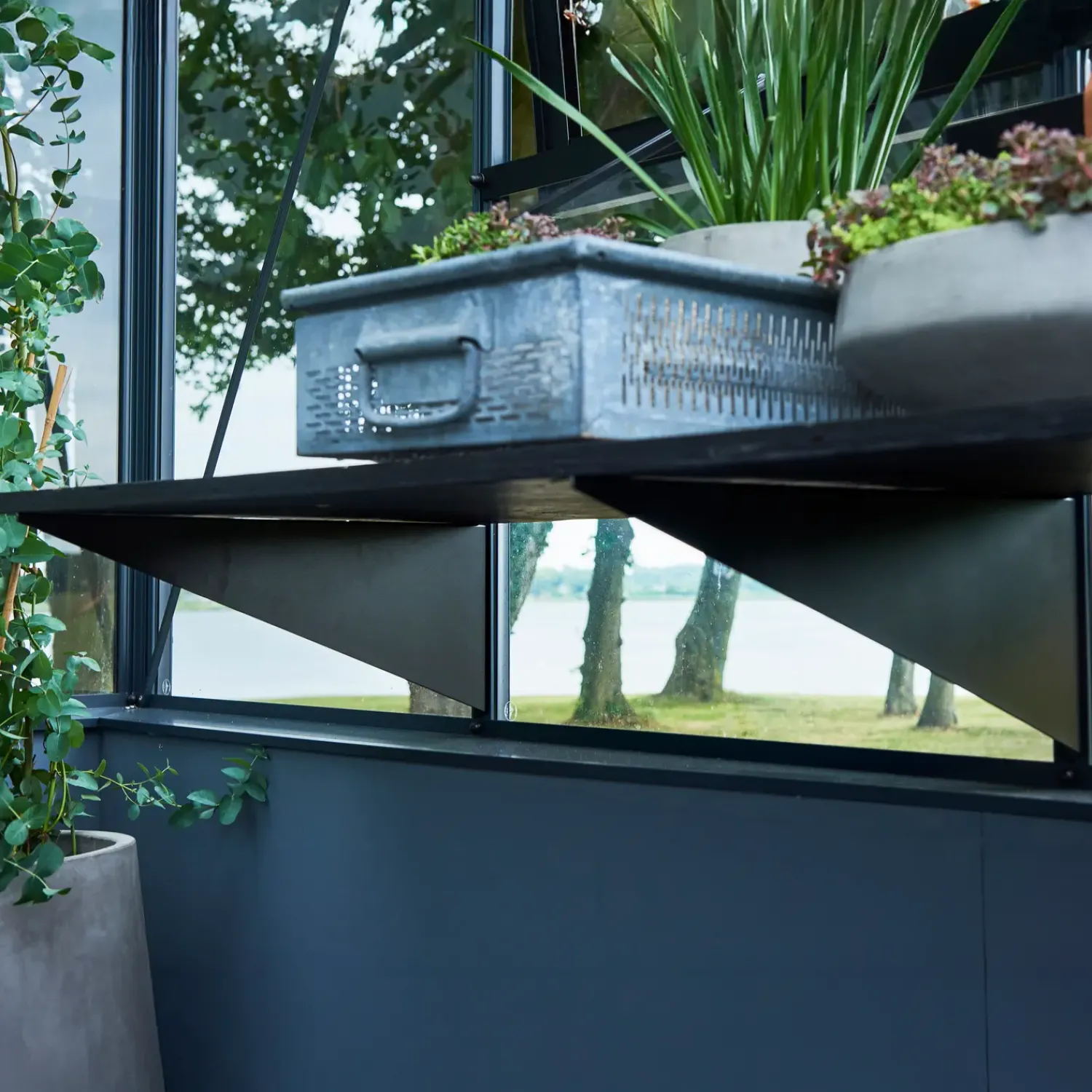 Vil du selv lave dine hylder i f.eks. træ eller glas, kan du købe løse hyldeknægte, der kan monteres i drivhusets profilsystem. Der medfølger specialbolte for montage.