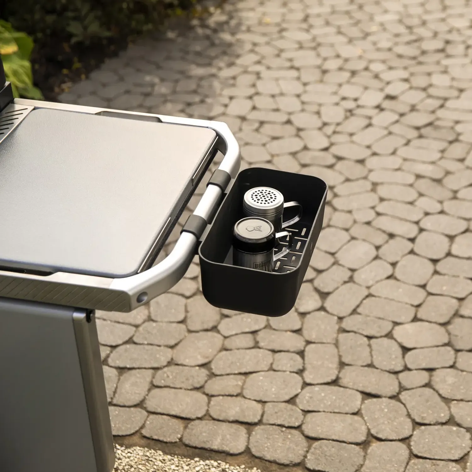Hav saucer og krydderier lige ved hånden ved grillen eller stegepladen, når du har brug for dem, med Weber Works-krydderiholderen. Du klikker den bare nemt fast på Weber Works-skinnen, så flasker og bøtter er lige ved hånden, og du behøver derfor ikke bruge plads på dit sidebord, men kan i stedet bruge det til klargøring og servering.