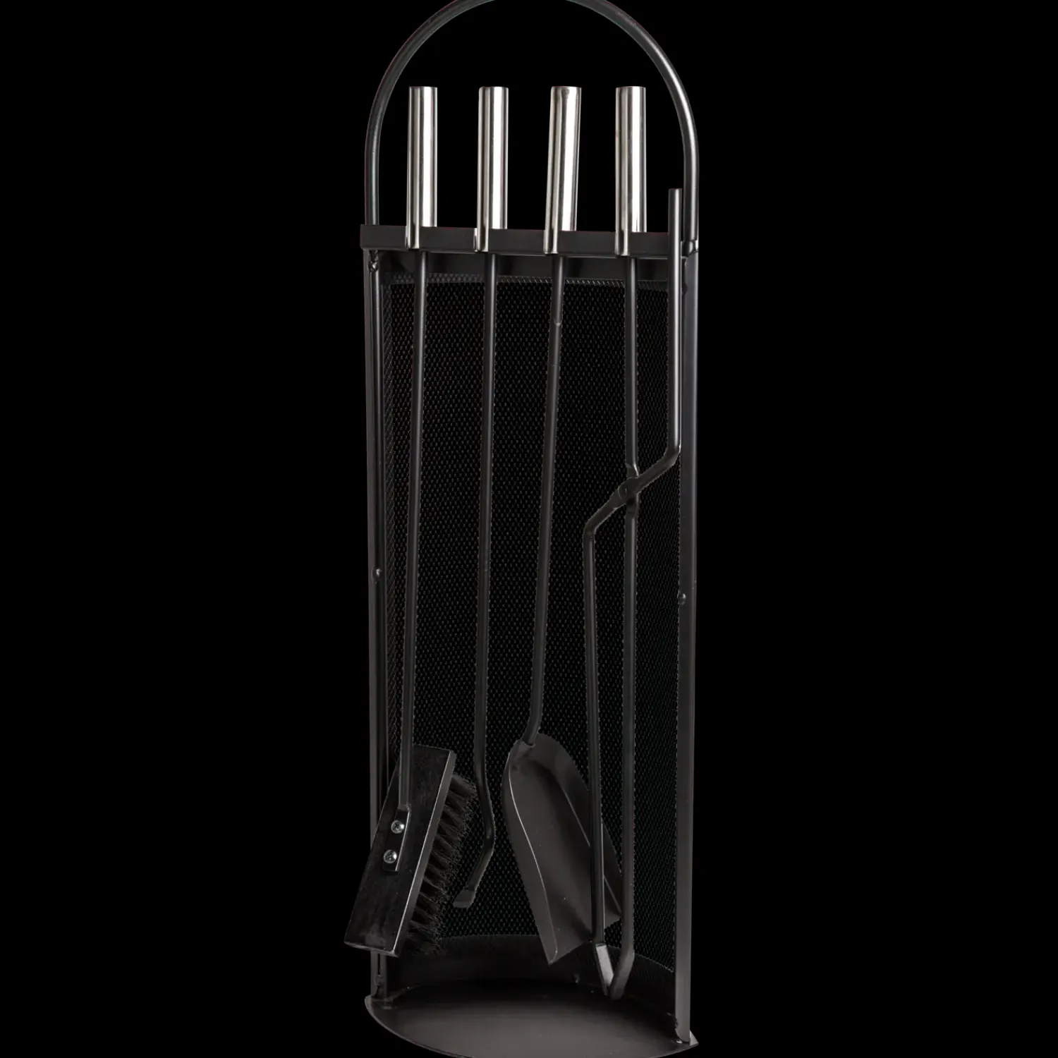 Når det stilrene pejsesæt ikke er i brug, kan det hænges på det medfølgende stativ, som er afgrænset af et diskret gitter. Alle dele er udstyret med greb i rustfri stål.