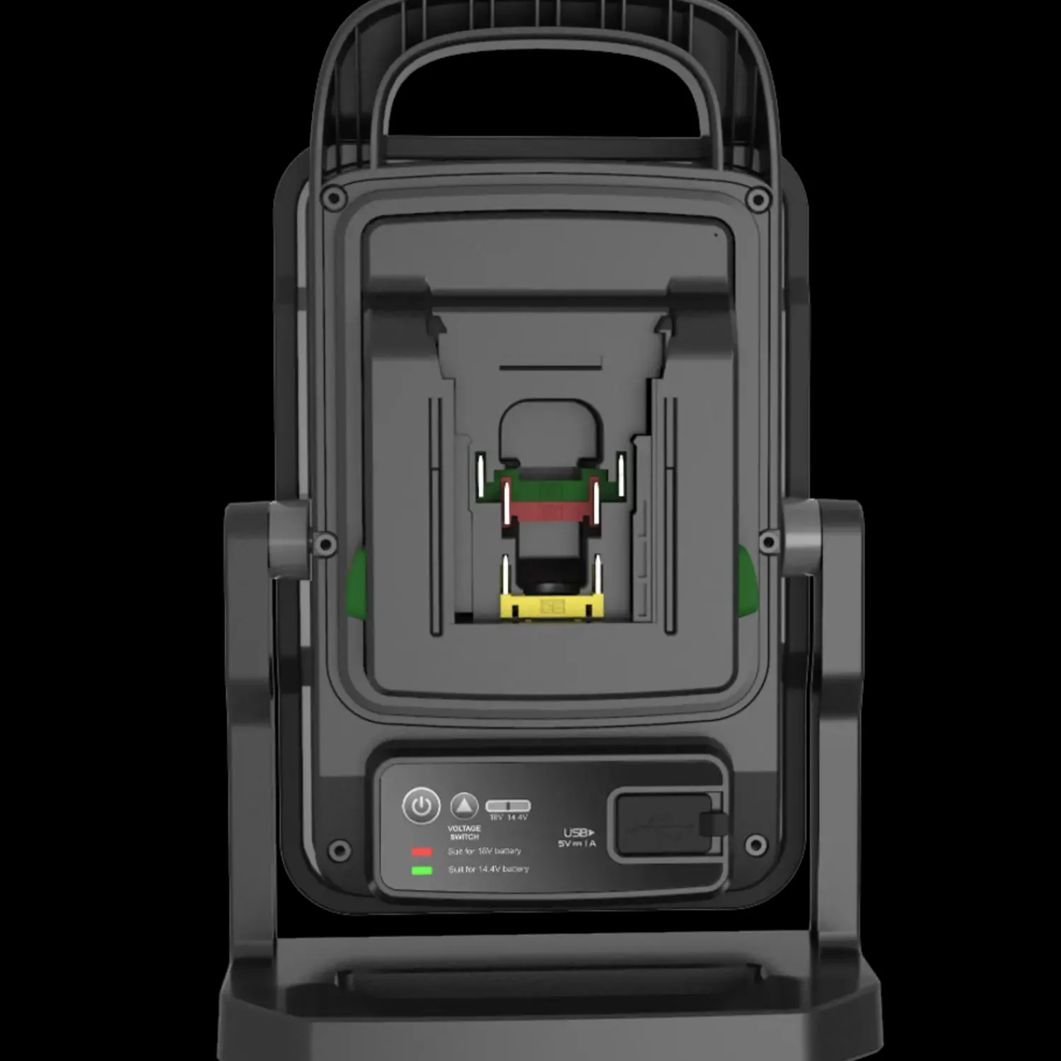 - Lampen er kompatibel med elværktøjs-batterier på 14,4 & 18V fra Dewalt, Milwaukee og Metabo.