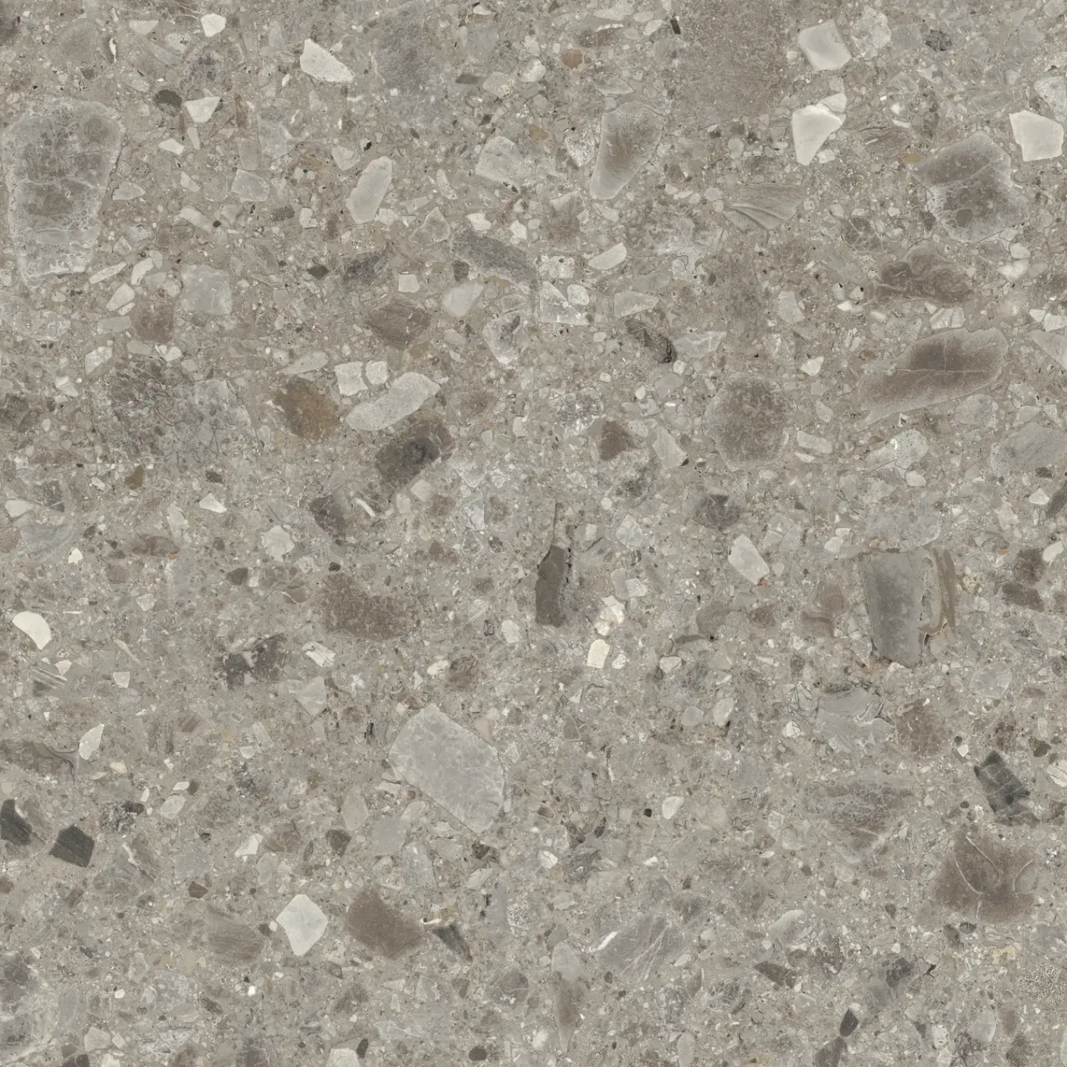 Ceppo di Gré er en grå stenart som indeholder en masse mindre sten. Ceppo di Gré skaber, med sine mange små sten og grå nuancer, et abstrakt mønster på gulvet.