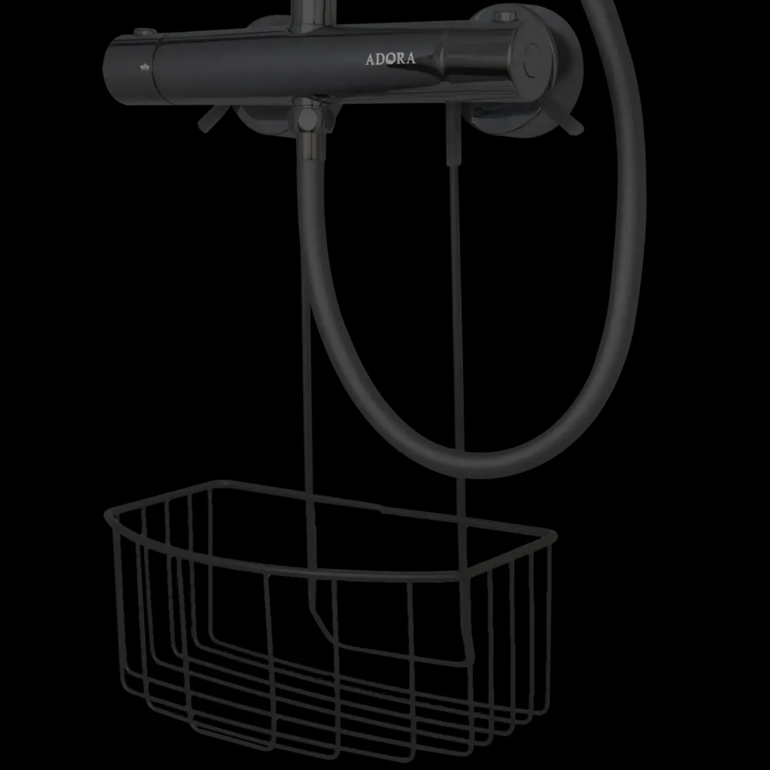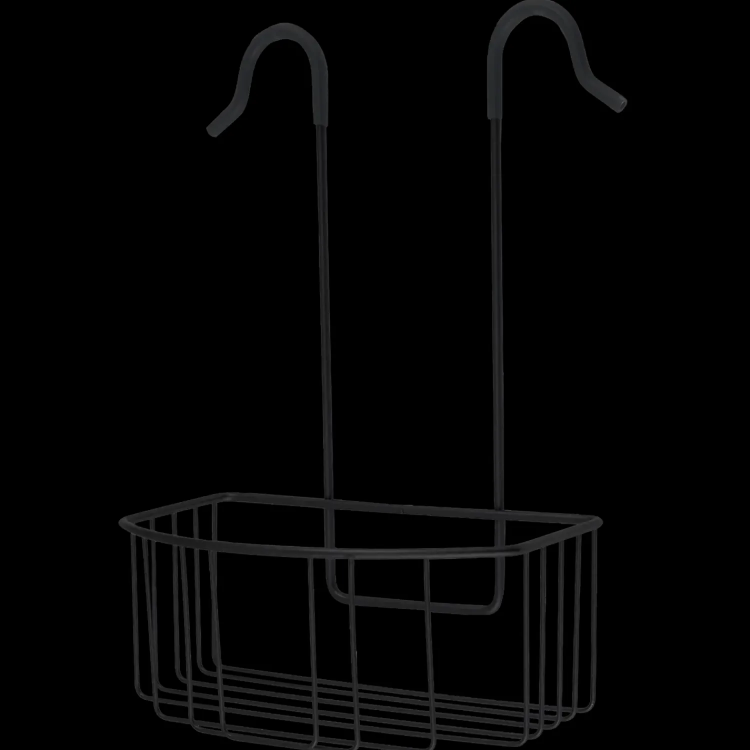 Trådkurv/hylde med bøjle ophæng der passer til brusearmaturer. En enkel og nem løsning så man undgår at bore huller i vådrumsvæggen. Fremstillet i stål med coate overflade i mat grå eller sort. Et stærkt materiale med en glat overflade.