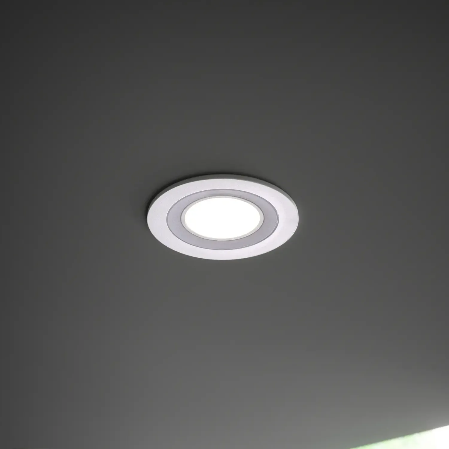 Indbygningsspot til indendørs montering i hvid med indbygget LED-modul på 5,5w. Diameter på 8,2 cm. Med 3 tænd/sluk funktion der ændre og dæmper lyset.