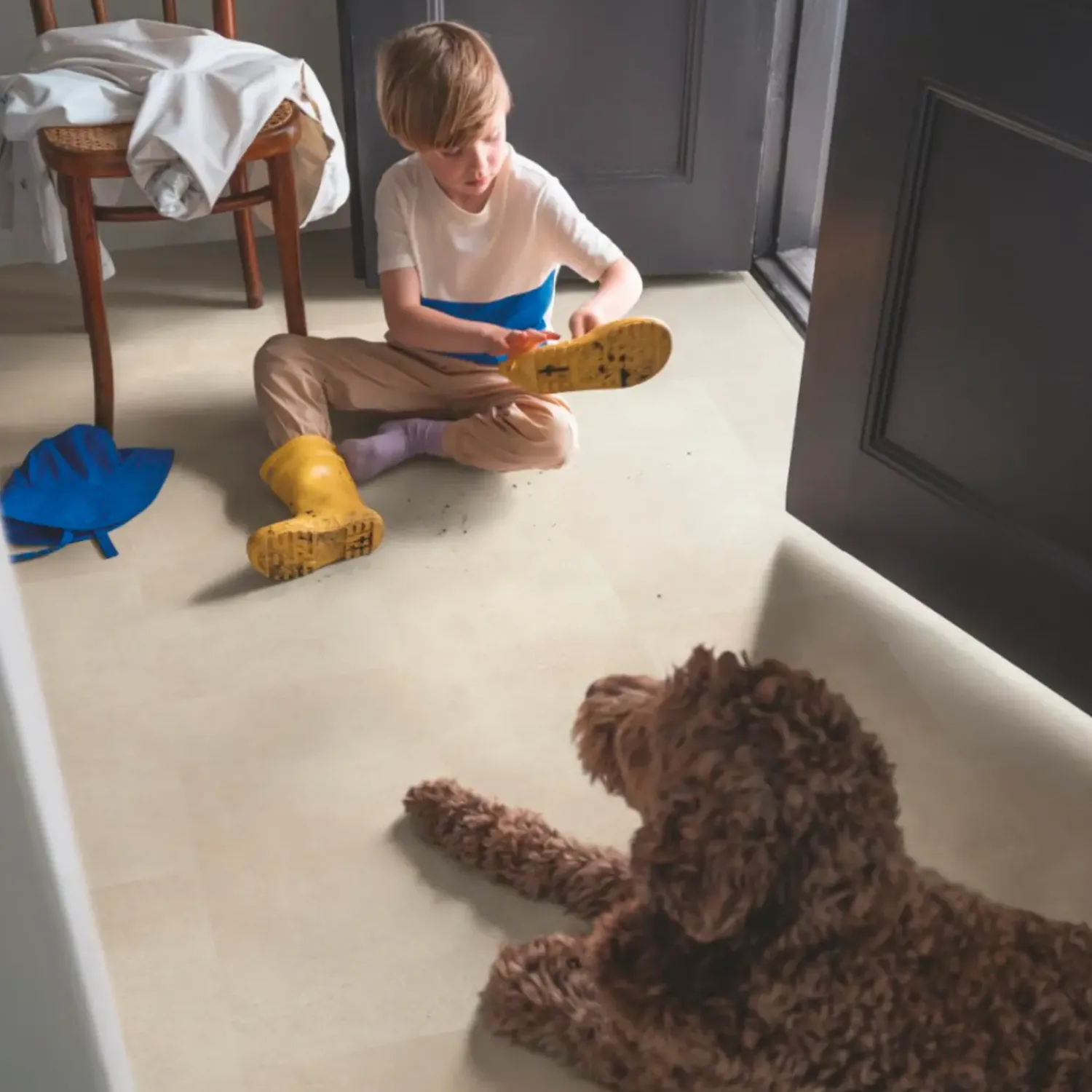 Alle Pergo gulve har AquaSafe, vores egenudviklede teknologi, der skaber en forseglet, 100 % vandtæt overflade hele vejen ned i samlingen. Aquasafe forhindrer vand i at trænge ned i gulvet. Det bliver ganske enkelt på overfladen, og du kan nemt tørre det af.