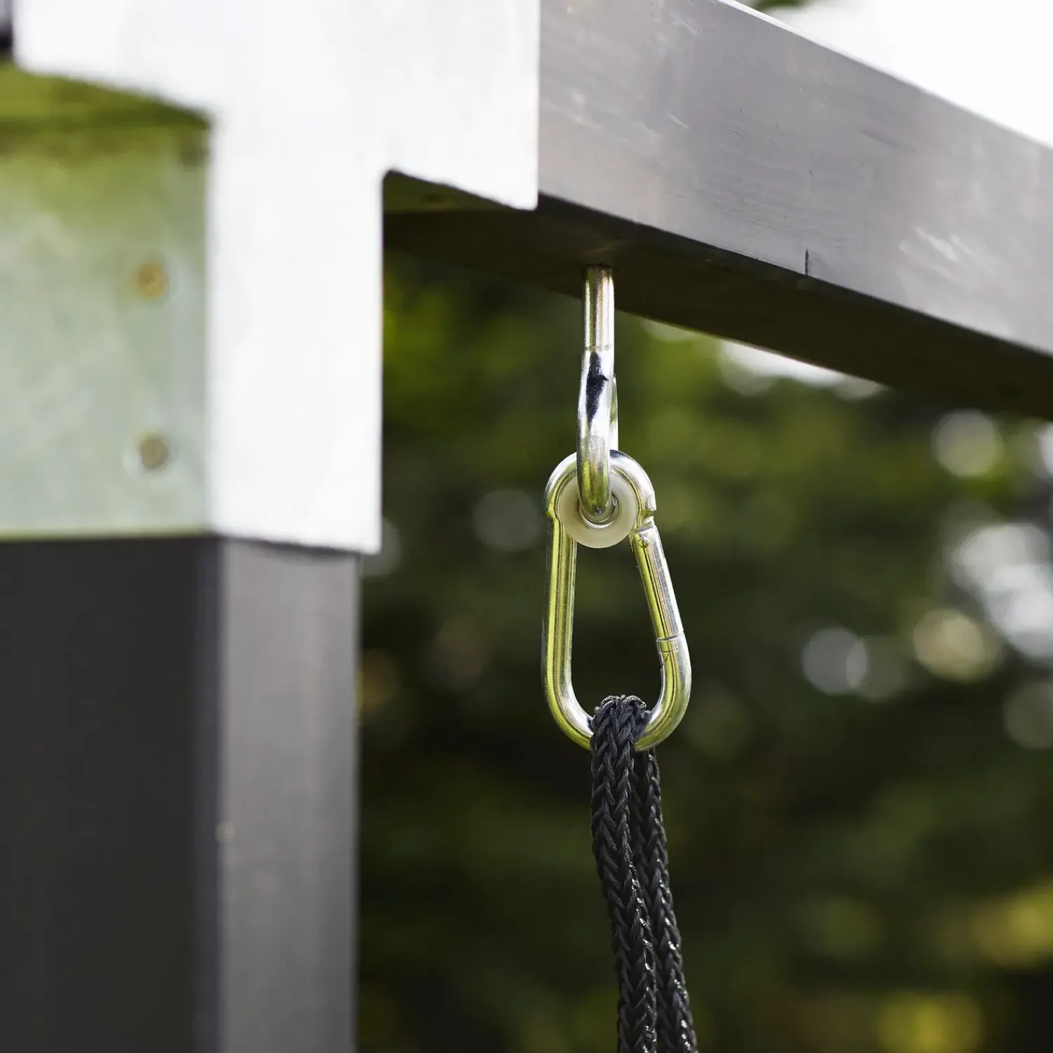 Karabinhager til gyngestativ fra Plus. Sættet indeholder 2 stk kabinhager.