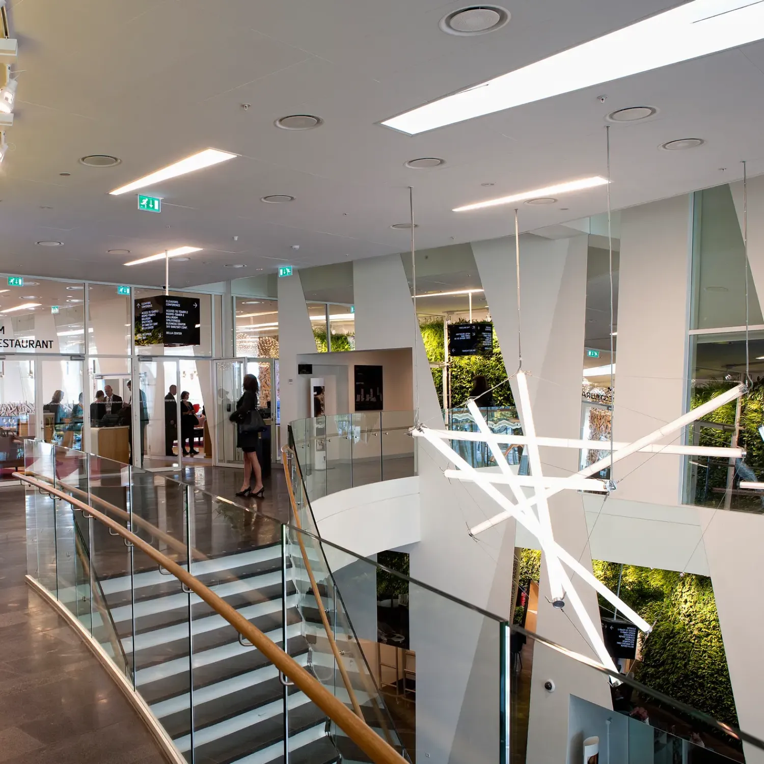Rockfon Sonar har en klassisk, hvidmalet overflade med mikrostruktur og glat fleece overflade. Her får du fuld designfrihed takket være de mange modulstørrelser og kantdetaljer. Den høje lydabsorption og lysrefleksion giver et lyst og komfortabelt indemiljø.