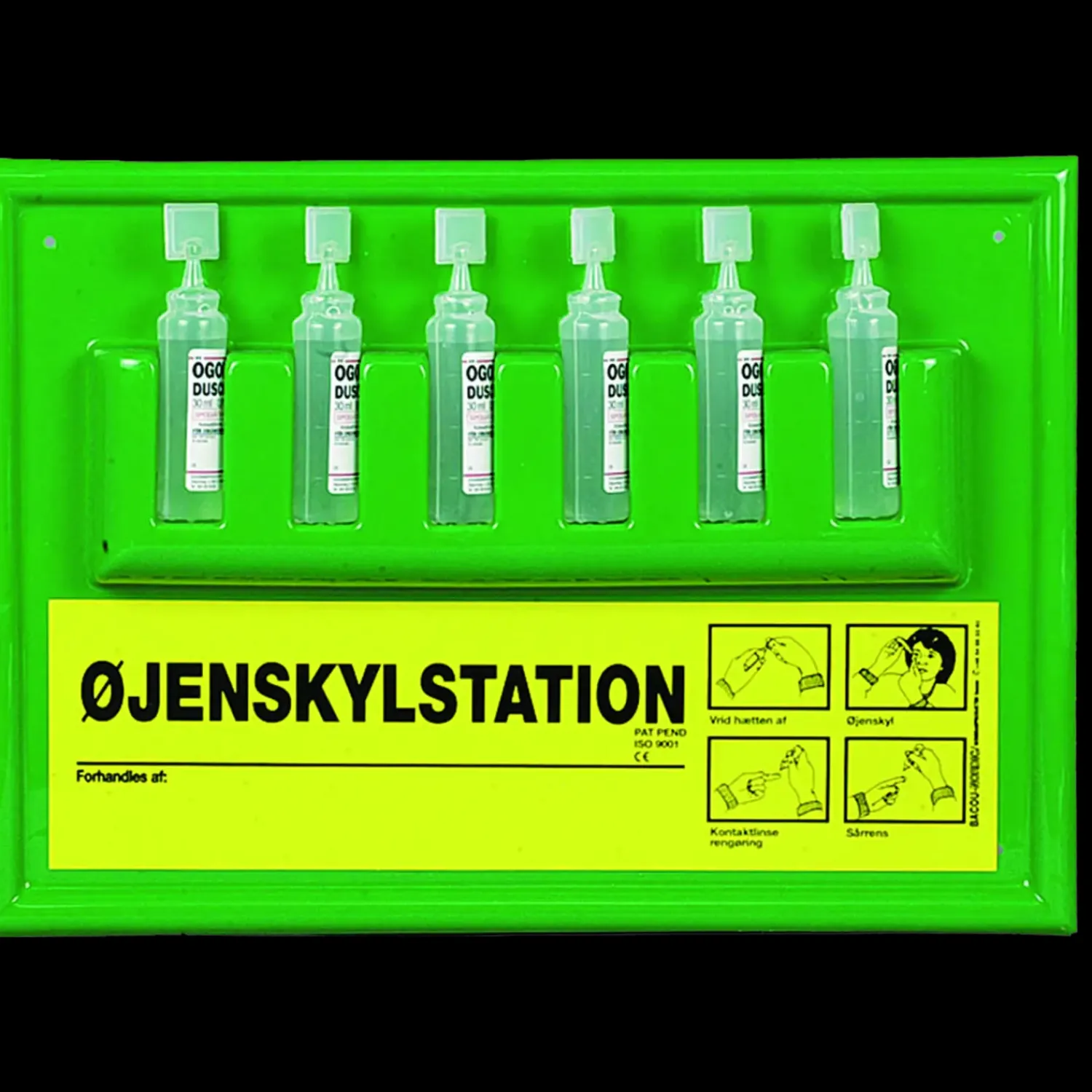 Tavle til vægmontering. Øjenskyl 30 ml. steril natriumklorid 0,9% saltvandsopløsning leveres i en rund ampul med skylletud, hvilket gør at den er nem at presse sammen. Twist-off hætten gør det let at åbne ampullen. Er klar til brug og giver en jævn stråle. Anvendes til skylning af øjne, små sår, instrumenter og til fugtning af kompresser. Indhold: 6 flasker á 30ml med steril 0,9% isotonisk natriumklorid opløsning. Opfyldning: 95502-1 Refill til øjenskylstation.