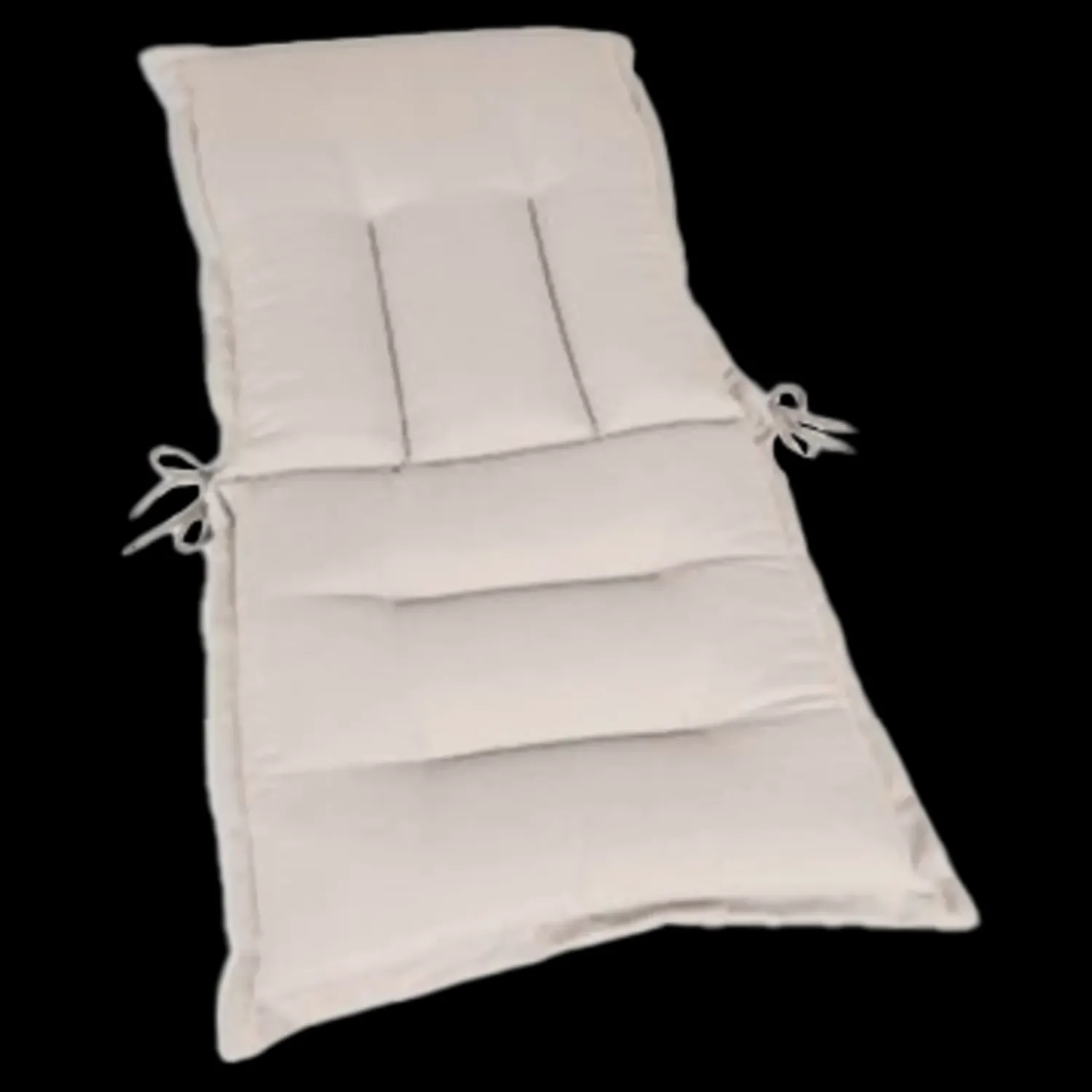 Grå stof af 100% genanvendte bomuldsfibre og plastflasker. Til alm. stol med lav ryg. Vandafvisende overfladebehandling der beskytter mod salt- og klorvand, UV-lys samt beskytter mod mug og skimmel. Rengøring: Hynderne kan håndvaskes ved 30°