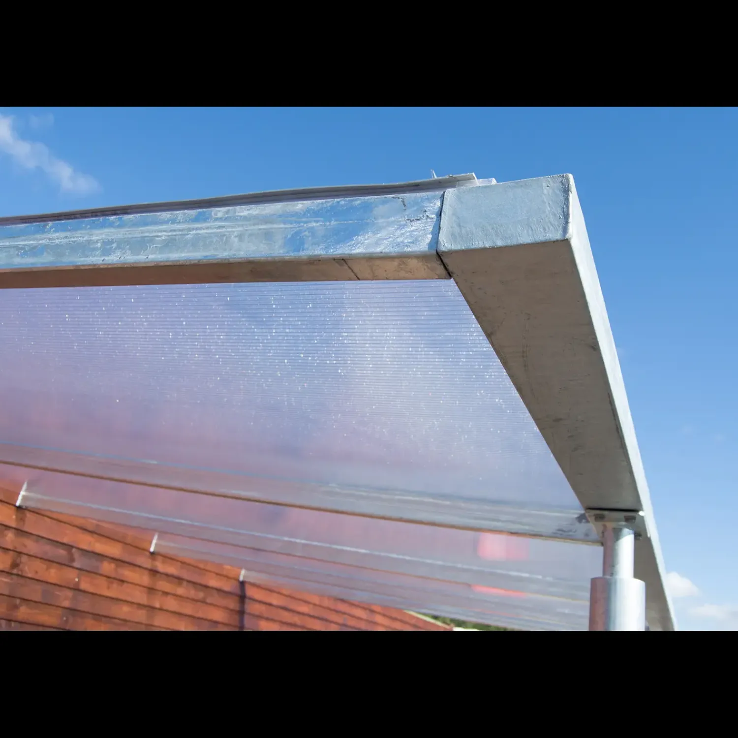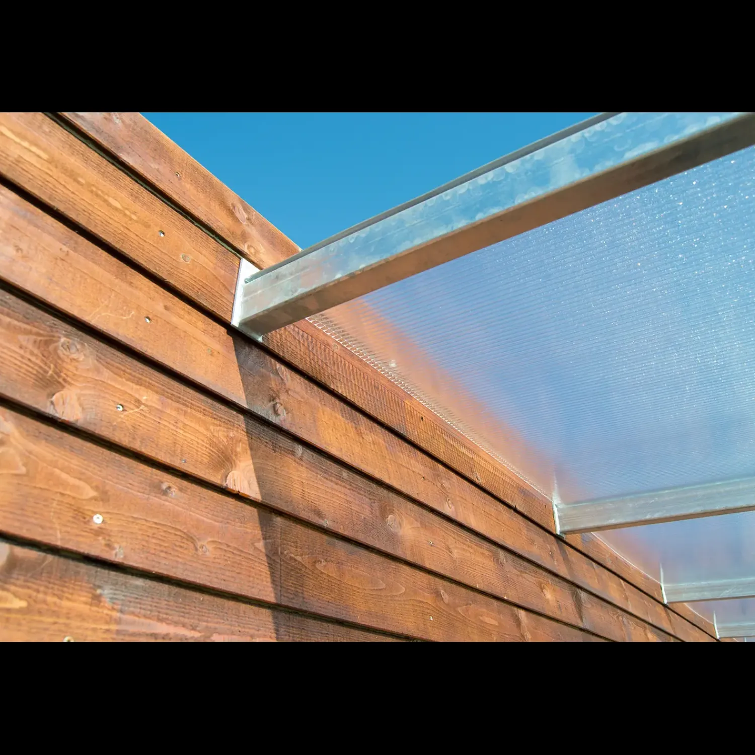 Let og hurtig terrasseoverdækning i galvaniseret stål, hvor lyset kan strømme igennem de gennemsigtige 10 mm tagplader. Overdækninger er med indbygget tagrende, som leder vandet væk fra taget og ned på jorden gennem afløb indbygget i de bærende runde stolper.