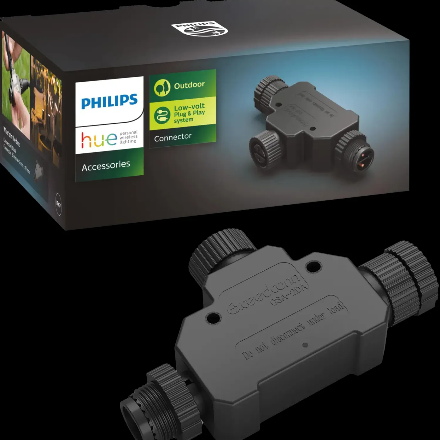 Philips Hue T-stykket gør det nemmere og mere fleksibelt for dig at forbinde dine Hue lav volt udendørslamper og rykke rundt på lampernes placering for at skabe den helt rette belysning i dine udendørsområder.