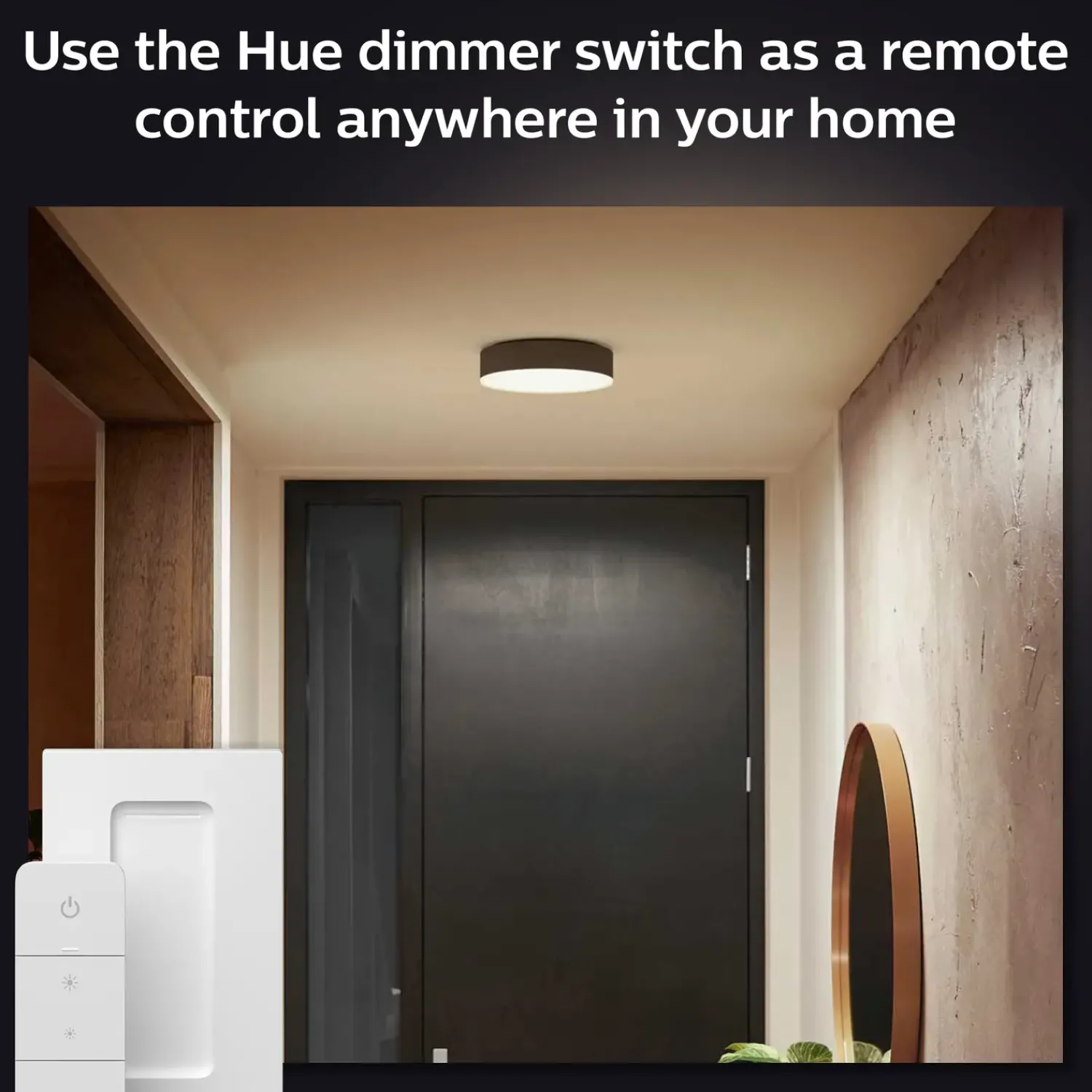 - Få øjeblikkelig kontrol over din intelligente belysning fra Philips Hue med en Hue dimmer switch. Med ét tryk på en knap kan du styre lyset i hele dit hus. Dæmp eller oplys rummene, tænd og sluk for lyset eller skift mellem belysningsscener