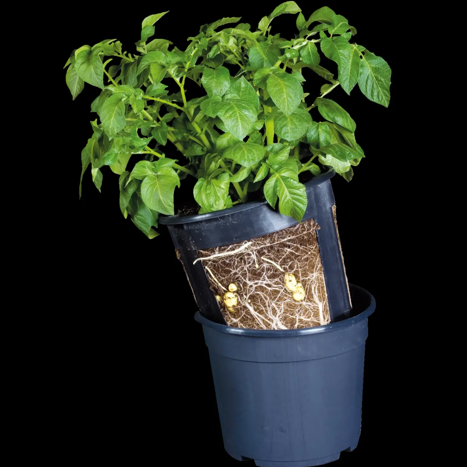 Det helt enkle potte-system består af 2 patenterede plastpotter, der sættes oven i hinanden de fyldes op med, en god gødet sphagnum for til slut at placere 2-3 læggekartofler ca. 10 cm under mulden.