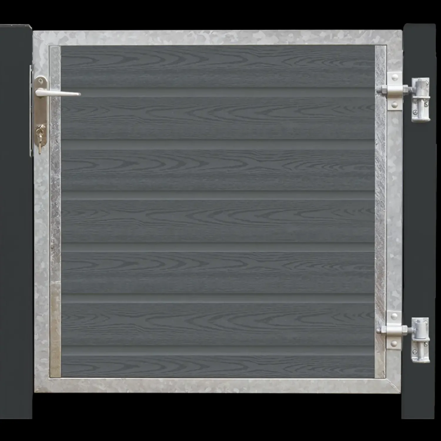 Højrehængt og indadgående låge med varmegalvaniseret ramme med kompositbeklædning.