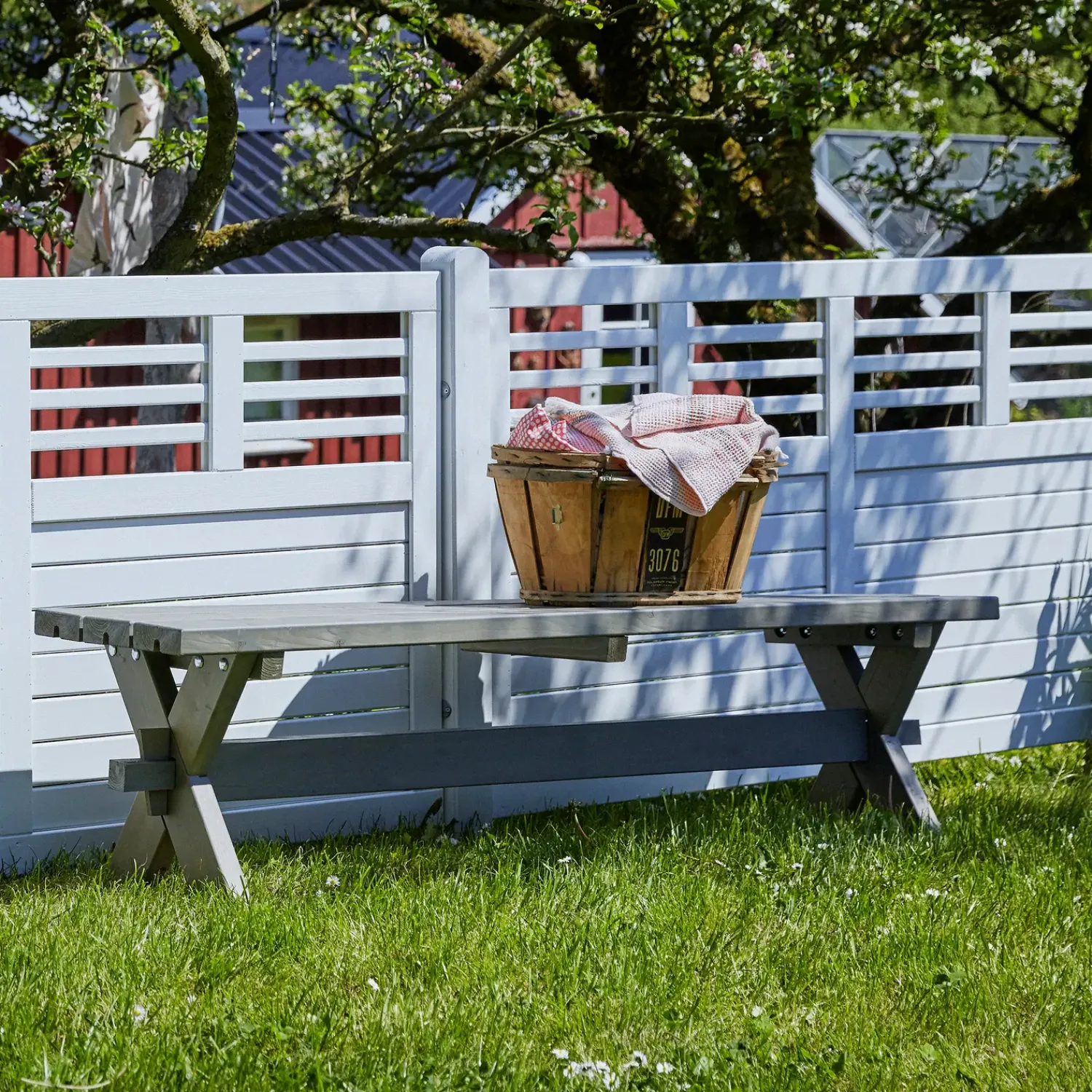 Nyd plankebænken på mange pladser i haven, den vil passe perfekt til udkigsområdet eller venteområdet. Desuden passer den til plankebordet på 177 cm. Det er en moderne plankebænk med sine massive planker på 42×116 mm. Bordet står solidt på de 42×116 massive træ fødder.