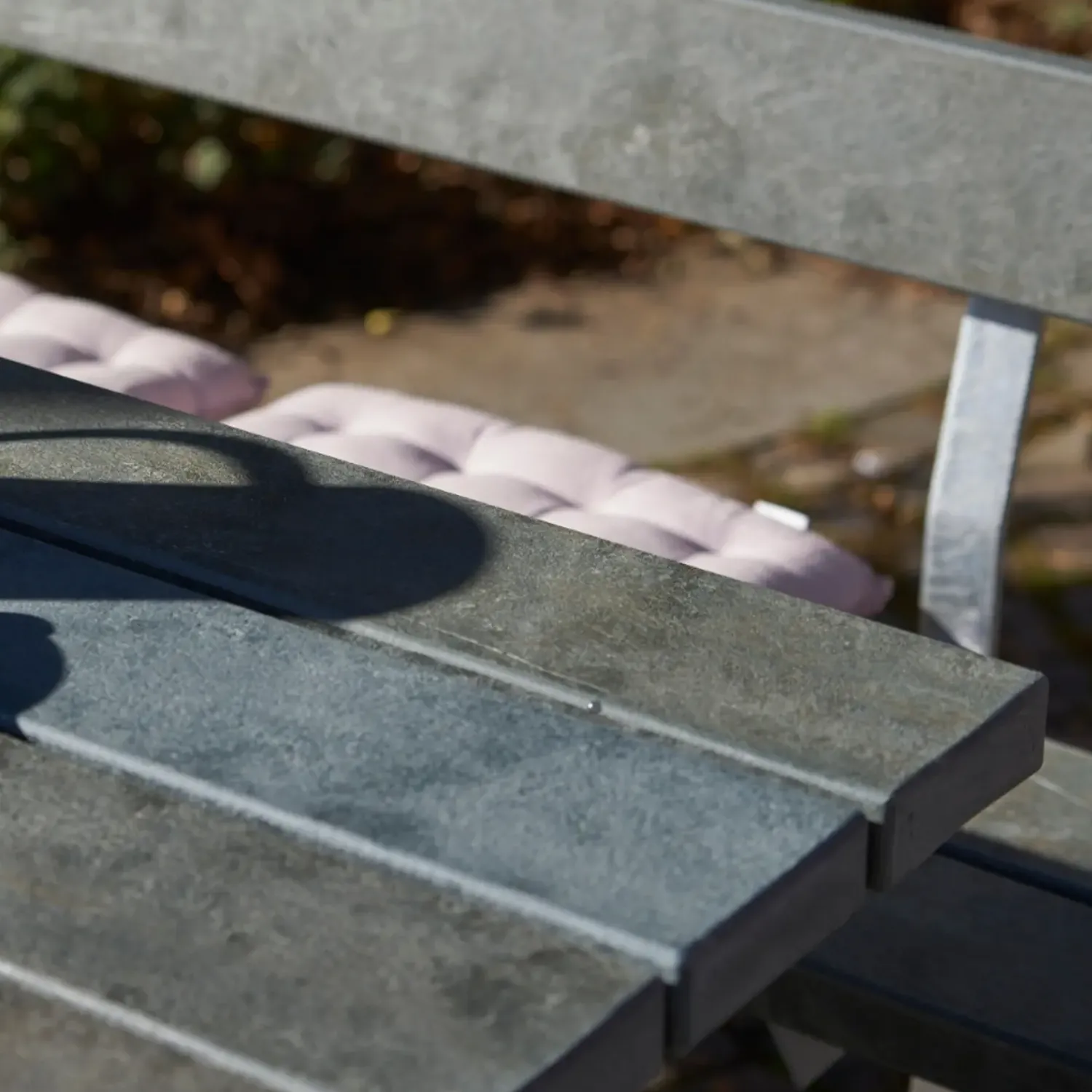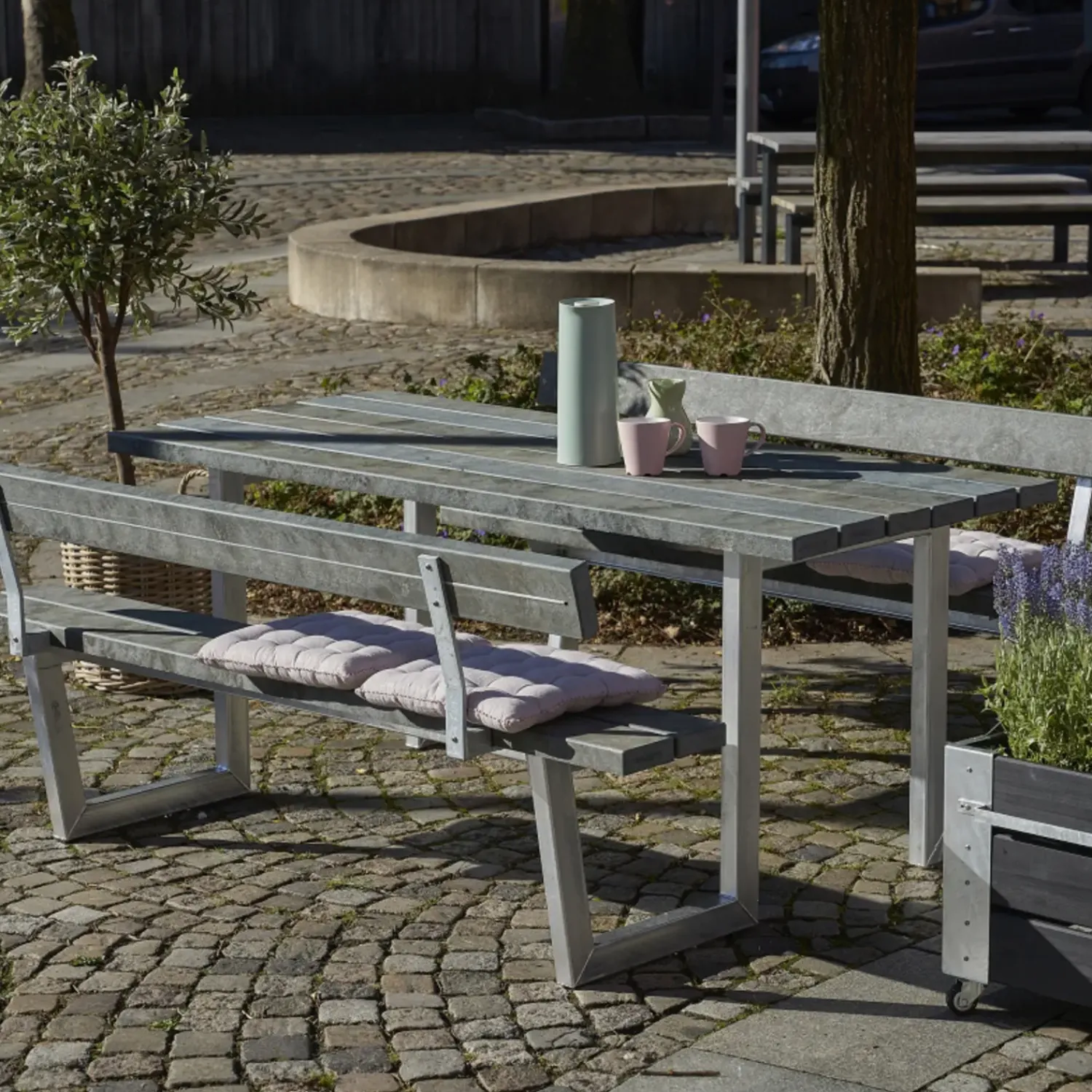 Dette bord/bænkesæt indbyder til at samvær, hyggelige og snaksagelige stunder i de udendøres omgivelser. Her kan rammerne skabes for de hyggelige sommer stunder på terassen, hvor det firkantede bord/bænkesæt indbyder til snak og grin på kryds og tværs af bordet. Vælg mellem forskellige materialer og farver.