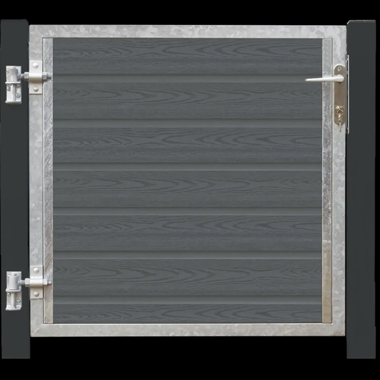 Venstrehængt og indadgående låge med varmegalvaniseret ramme med kompositbeklædning.