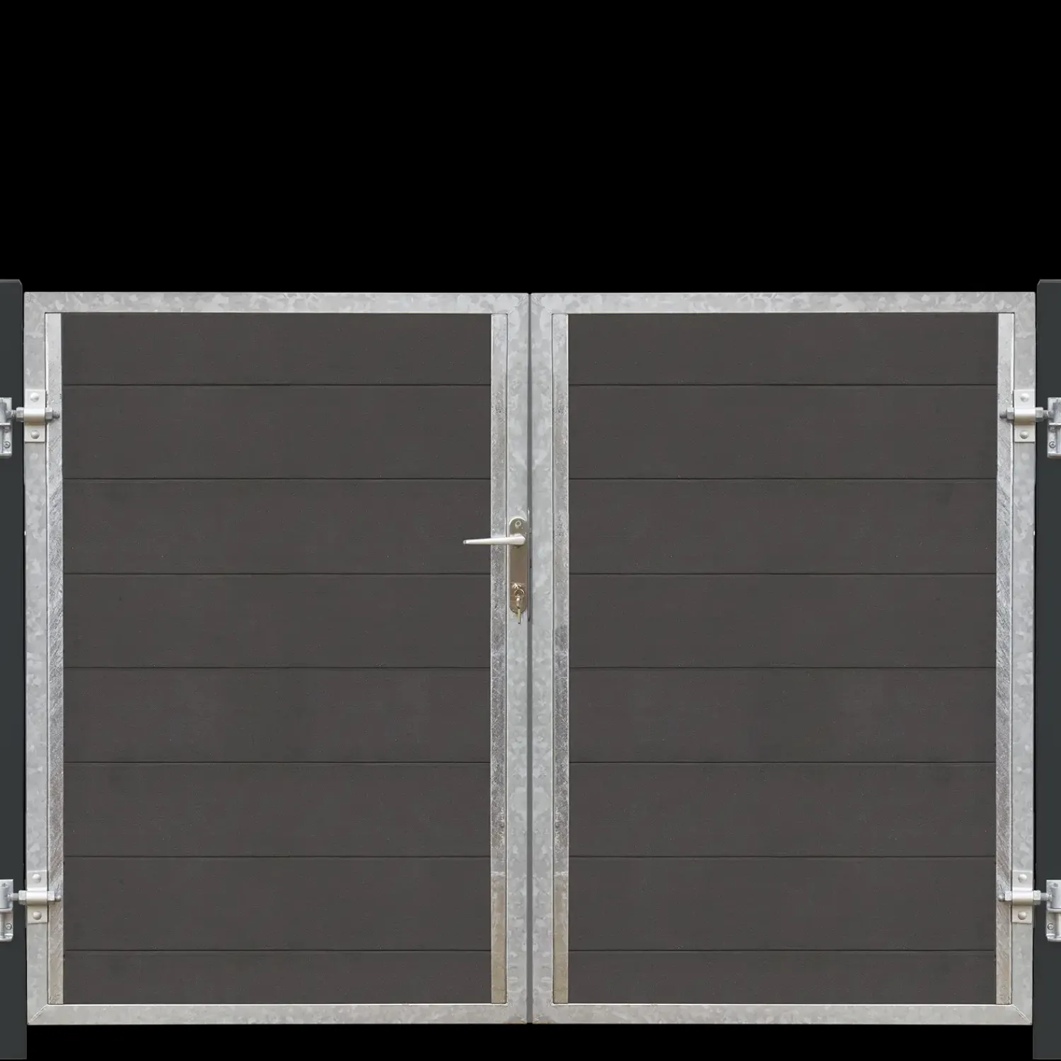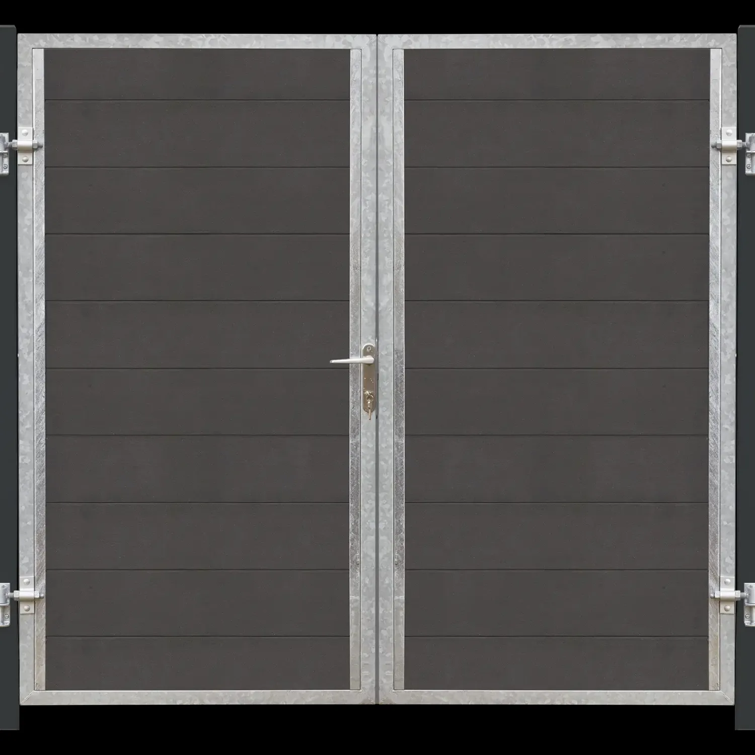 Venstrehængt og indadgående låge med varmegalvaniseret ramme med kompositbeklædning.