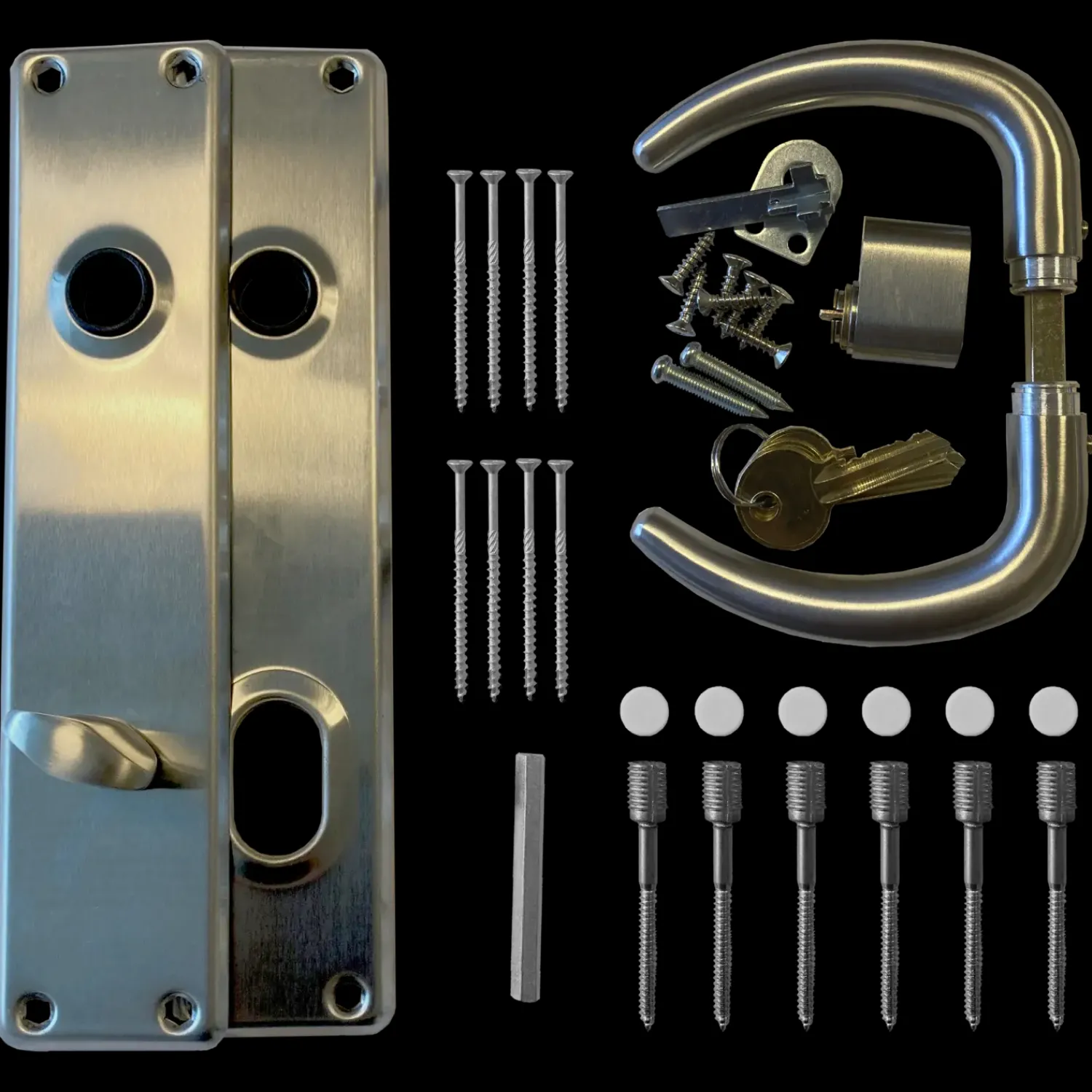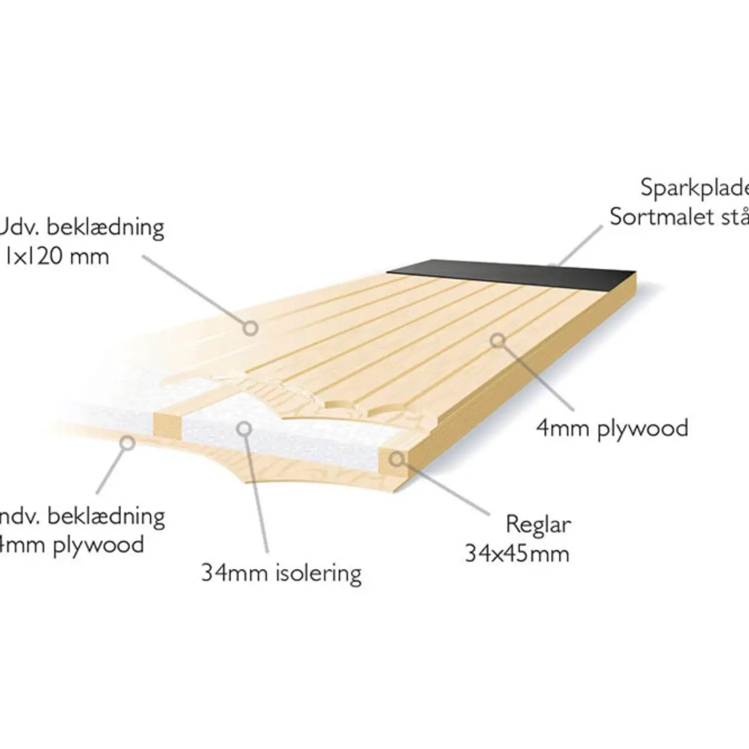 - Pakken består af 1x dør inkl. karm og låsekasse. Ekskl. greb, cylinder, karmskruer og tætningslister