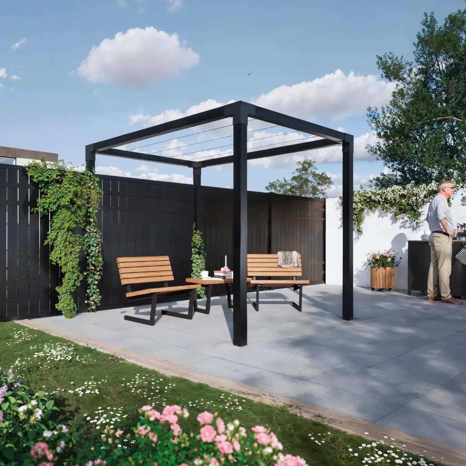 Daylife – model 6 – 179085-15Daylife-serien er designet som en hyldest til dagligdagen med alt, hvad den indebærer.Med Daylife er det nemlig nemt at skabe et socialt og skønt rum, der bringer familien tættere sammen undervejs i hverdagens mange gøremål. I det levende og dynamiske rum, som opstår med Daylife, forenes vasketøj, leg, træning og hygge. Med andre ord: Alt det, der for de fleste af os er en del af livet. Daylife leveres i overskuelige samlesæt, så det er nemt og hurtigt for dig at bygge dit nye, skræddersyede uderum.Varenr. består af:Komplet løsning med Cubic beslag og tørresnor samt stolper til nedgravning. Inkl. skruer.Beslag:Cubic Hjørnebeslag Dobbelt 20×20×20 cm (4 stk.).Galvaniseret og pulverlakeret sort.Tørresnor:Ø4 mm × 20 meter.Sort – UV beskyttet polyester.Inkl. wirestrammer.Stolper:Omlimede træstolper 9×9 cm til nedgravning.Trykimprægneret (NTR mærkert klasse A) og grundmalet sort.Nærmeste RAL 9005 – vandbaseret.Trykimprægneret NTR mærket klasse A – betyder, at de er effektivt beskyttet mod råd og tåler nedgravning. Stolperne er sammenlimet (omlimet) af to stykker træ for at mindske revnedannelser og vridning samt sikre styrke og formstabilitet.Leveres som “Saml selv”.