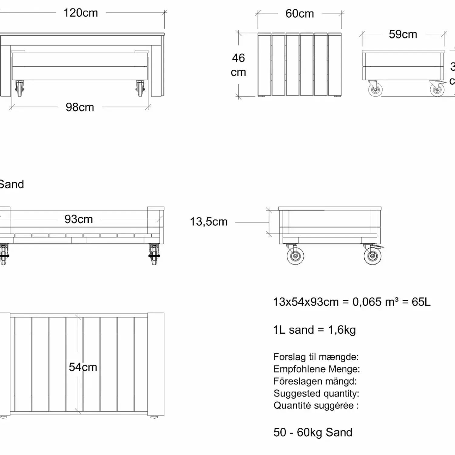 Fun bænk og multikasse m/hjul – 120 cm – 18260-1Enkel og praktisk bænk med multikasse, som passer under bænken.Bænken er ideel til yndlingspottet i haven, på terrassen, altanen eller ved indgangen, hvor uderummet kan nydes på varme sommerdage og kølige aftener.Multikassen kan bruges til opbevaring af f.eks. små haveredskaber og potter eller havespil som kroket, petanque og kongespil.Kassen kan også bruges som plantekasse eller en mini køkkenhave og er ideel til både blomster, planter, grøntsager og krydderurter.De store hjul gør det nemt at flytte kassen, selv når den er fyldt med ting eller planter.Varenr. består af:Bænk og multikasse med hjul samt fiberdug og skruer.Bænk:Ubehandlet nåletræ.120×60 cm.Siddehøjde 46 cm.Multikasse:Ubehandlet nåletræ.99×59 cm.Højde 33 cm (med hjul).Hjul Ø100 – 2 uden stop og 2 med stop (bremselås).Fibertex dug:Non-woven dug i polypropylen og polyester.160×150 cm.Dugen tilpasses.Leveres ubehandlet og som “Saml selv”.PLUS anbefaler altid grundbehandling inden opstilling.