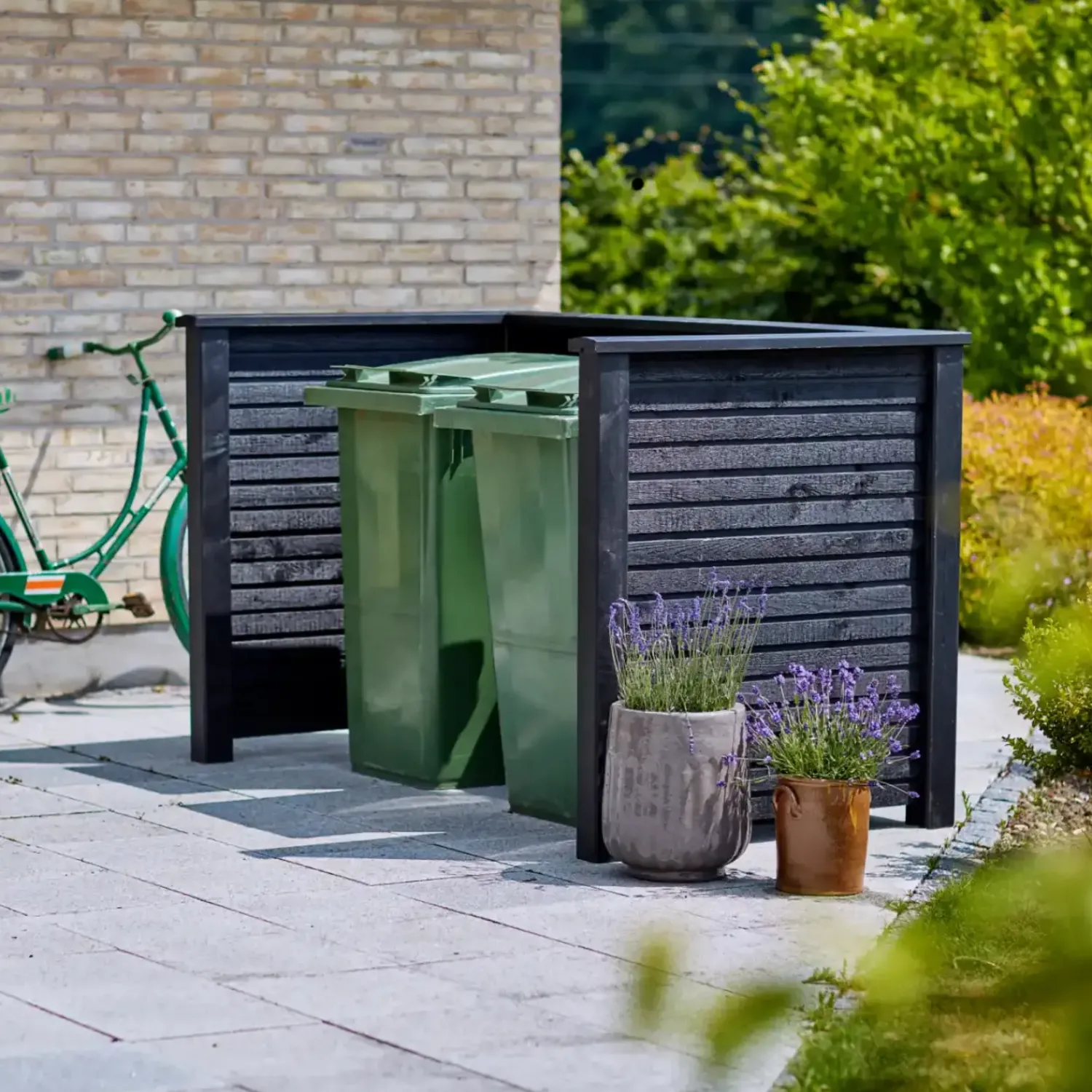Renovationsskjul Plank Profil – sort – m/træstolper til nedgravning – PEFC – 26620-15Renovationsskjulet vil ikke kun skjule dit skrald med stil, men også pynte på din indkørsel. Der findes ikke noget kedeligere, end at synet af de grå eller grønne kedelige skraldespande. Løsningen er et skraldespandsskjul, som gemmer dine skraldespande lidt væk, så det ikke er det første gæsterne møder, når de kører ind ad indkørslen.Plank Profil Renovationsskjul er bygget op af hegnselementer fra Plank Profilhegn serien, hvilket giver dig mulighed for at bygge videre på renovationsskjulet, så det passer til netop dit behov og ønsker.Varenr. består af:Renovationsskjul med plads til 2 spande (mål 58×107,5 cm / 240 ltr.). Inkl. skruer.Sider:· Profilbrædder m/1 spor 25×140 mm· Savskåret og høvlet· Inkl. skruer og topbræt til afslutning· Monteres direkte i stolpen· Trykimprægneret og grundmalet sort· Sort RAL 9005Stolper:· Grundmalet krydsskårne profilstolper m/spor 9×9 cm – til nedgravning· Trykimprægneret NTR mærket klasse A, hvilket betyder, at de er effektivt beskyttet mod råd og tåler nedgravningLeveres som “Saml selv”.Byg selv efter ønsker og behov
