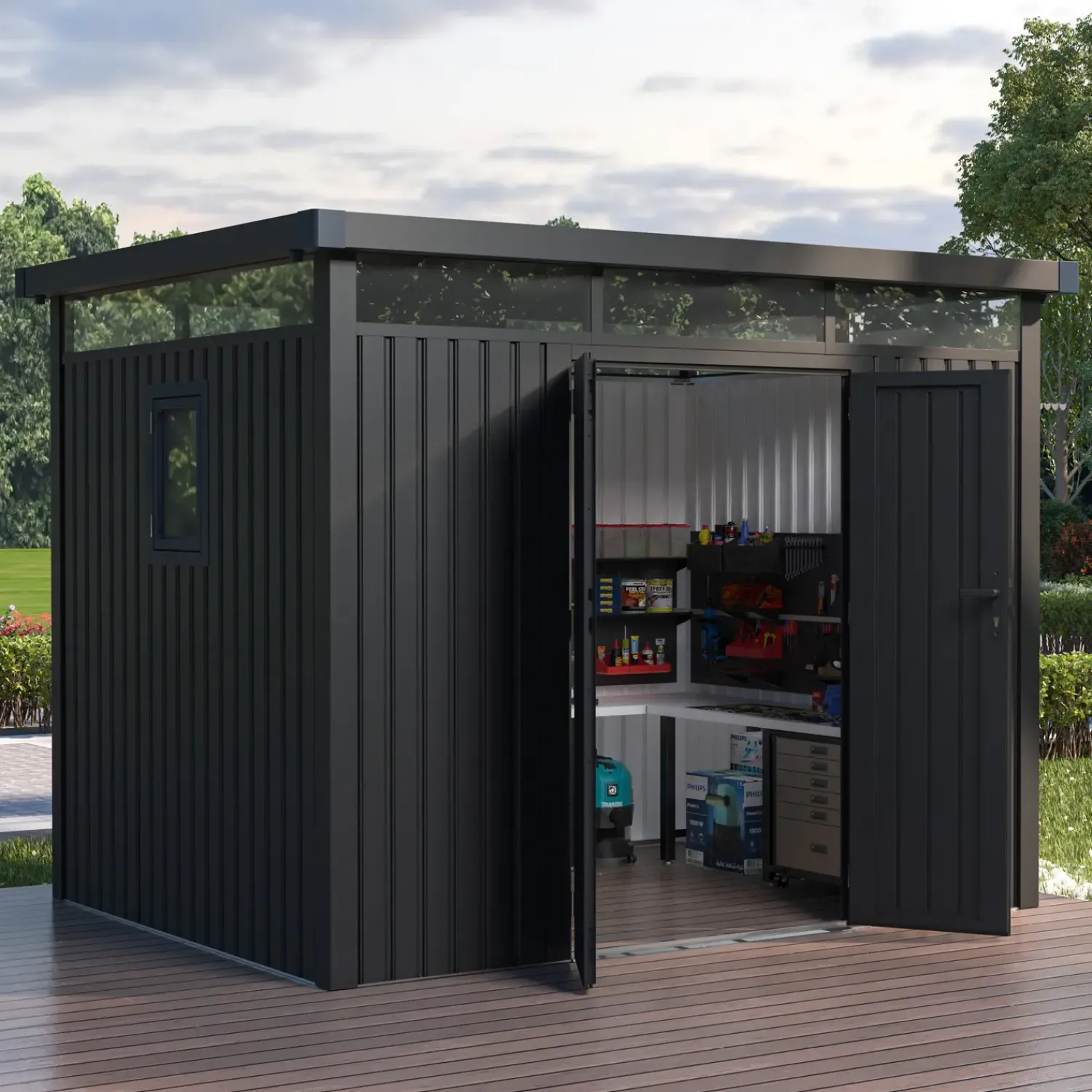 Anne Premium redskabsskur er til dig, der ønsker ekstra plads til opbevaring. Skuret kan med fordel anvendes til opbevaring af cykler, haveredskaber eller værktøj. Praktisk redskabsrum der er fremstillet i forstærket og tykkere stål. Derudover er Anne Premium fremstillet med dobbeltdør, ovenlysvinduer og almindelige vinduer, der kan åbnes, hvilket giver et fint lysindfald og luftgennemstrømning i rummet.