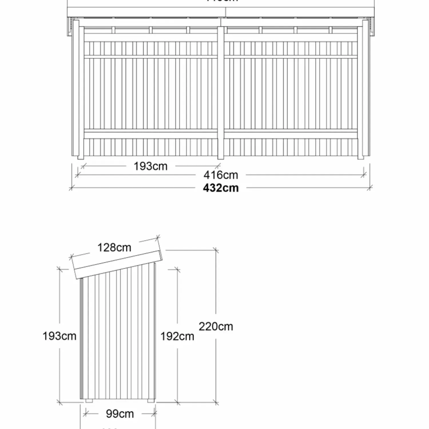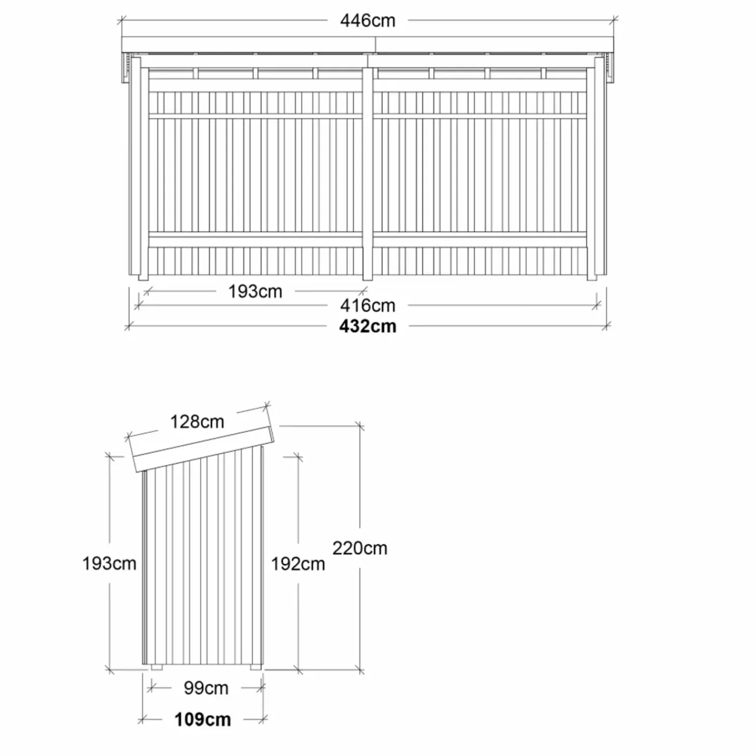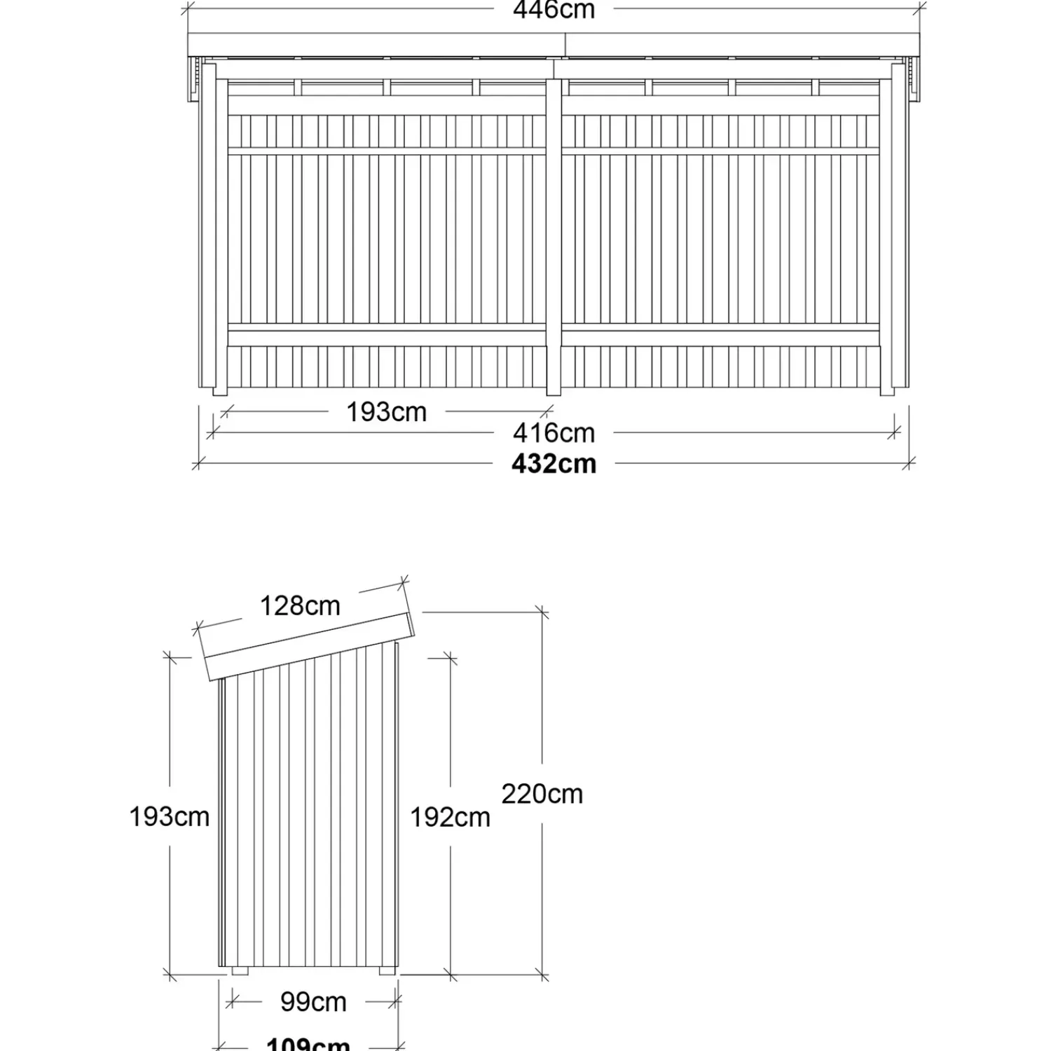 - Udvendig grundmål: 432×109 cm (LxB)
