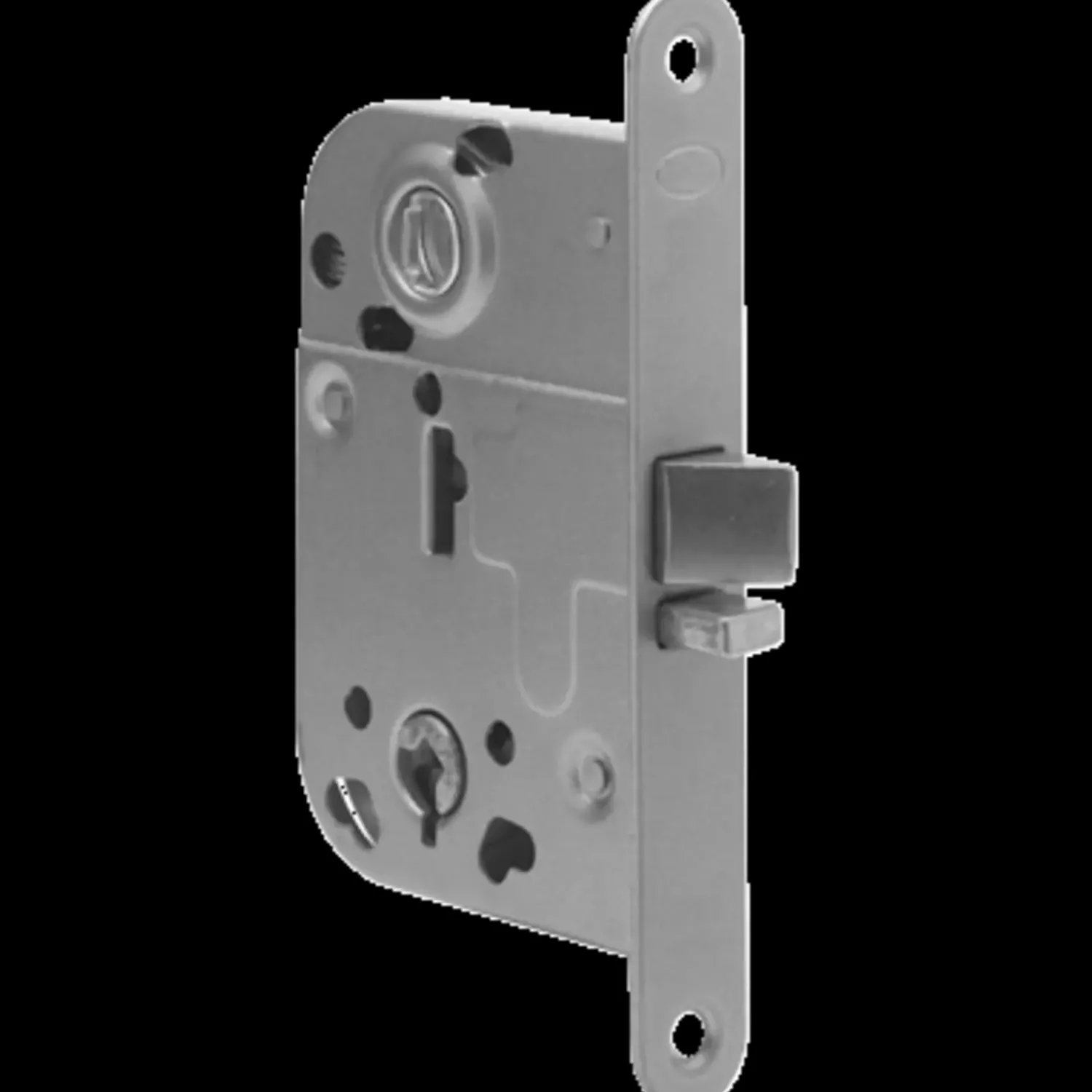 Mellemdørslås 2014 gul-eloxeret inkl. slutblik og højre/vendbar. Låsen anvendes i mellemdøre eller toiletdøre.