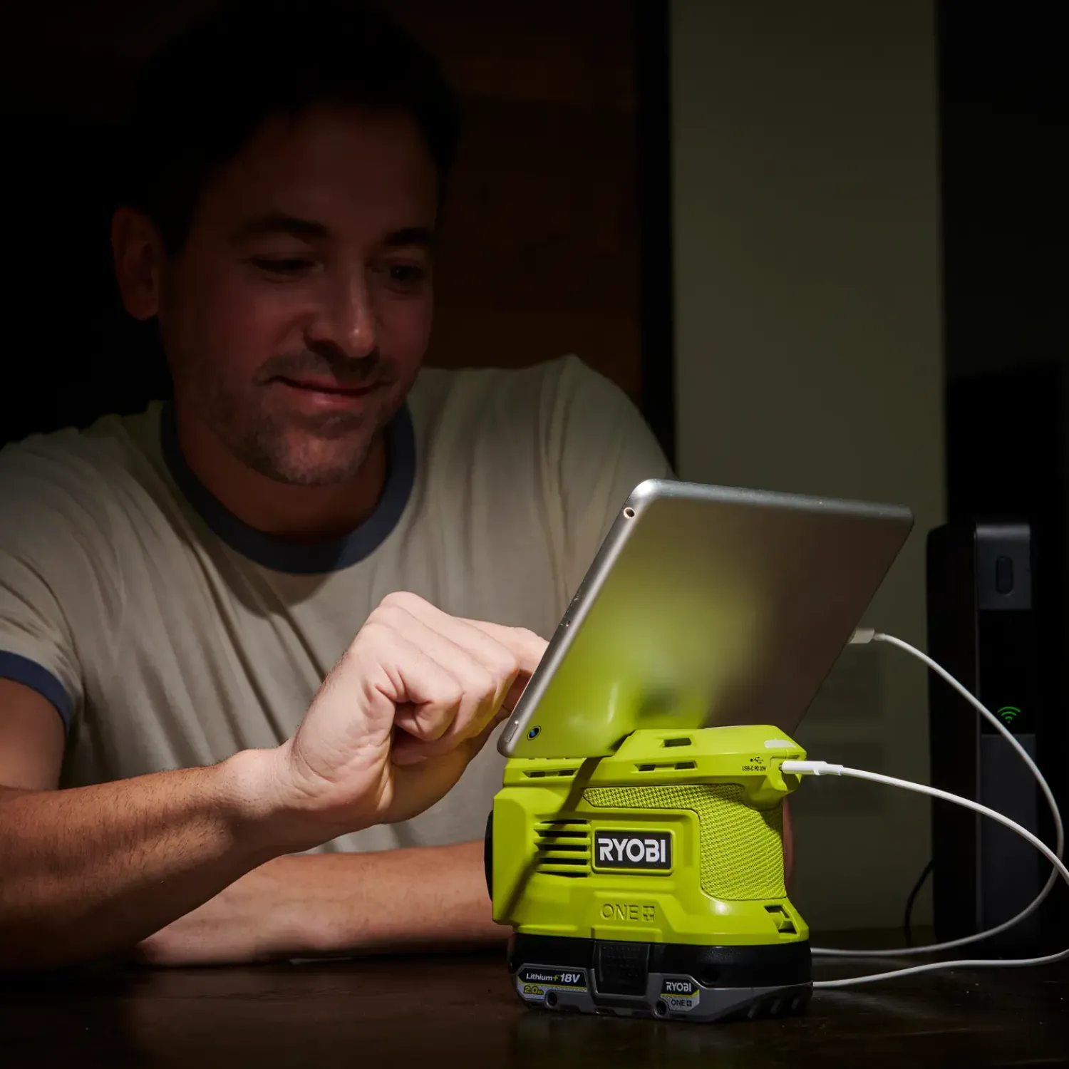 - Kan oplade Ryobi ONE+-batterier med en hastighed på 1,7 Amp med det medfølgende USB-C-kabel og stikkontakt