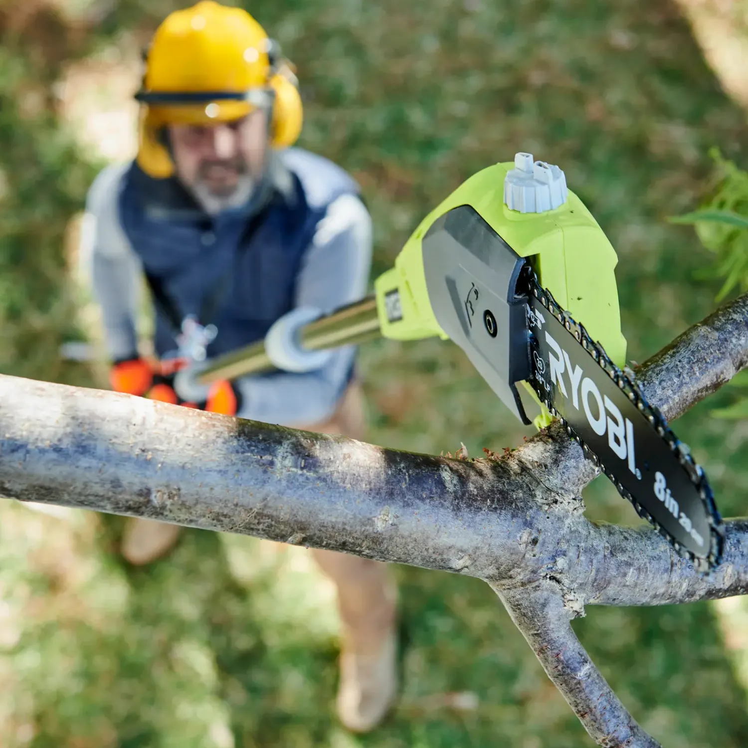 Med Ryobi OPP1820 akku teleskop grensav 18V er det nemt at beskære selv de høje træer. Den effektive sav har en sværdlængde på 20 cm.