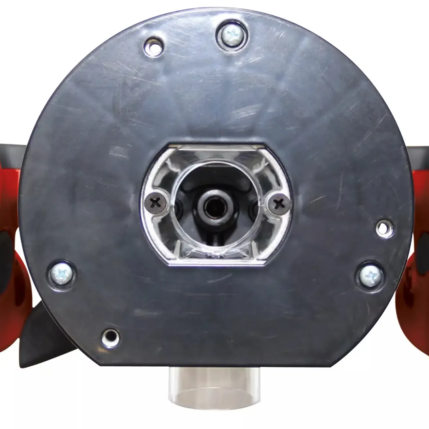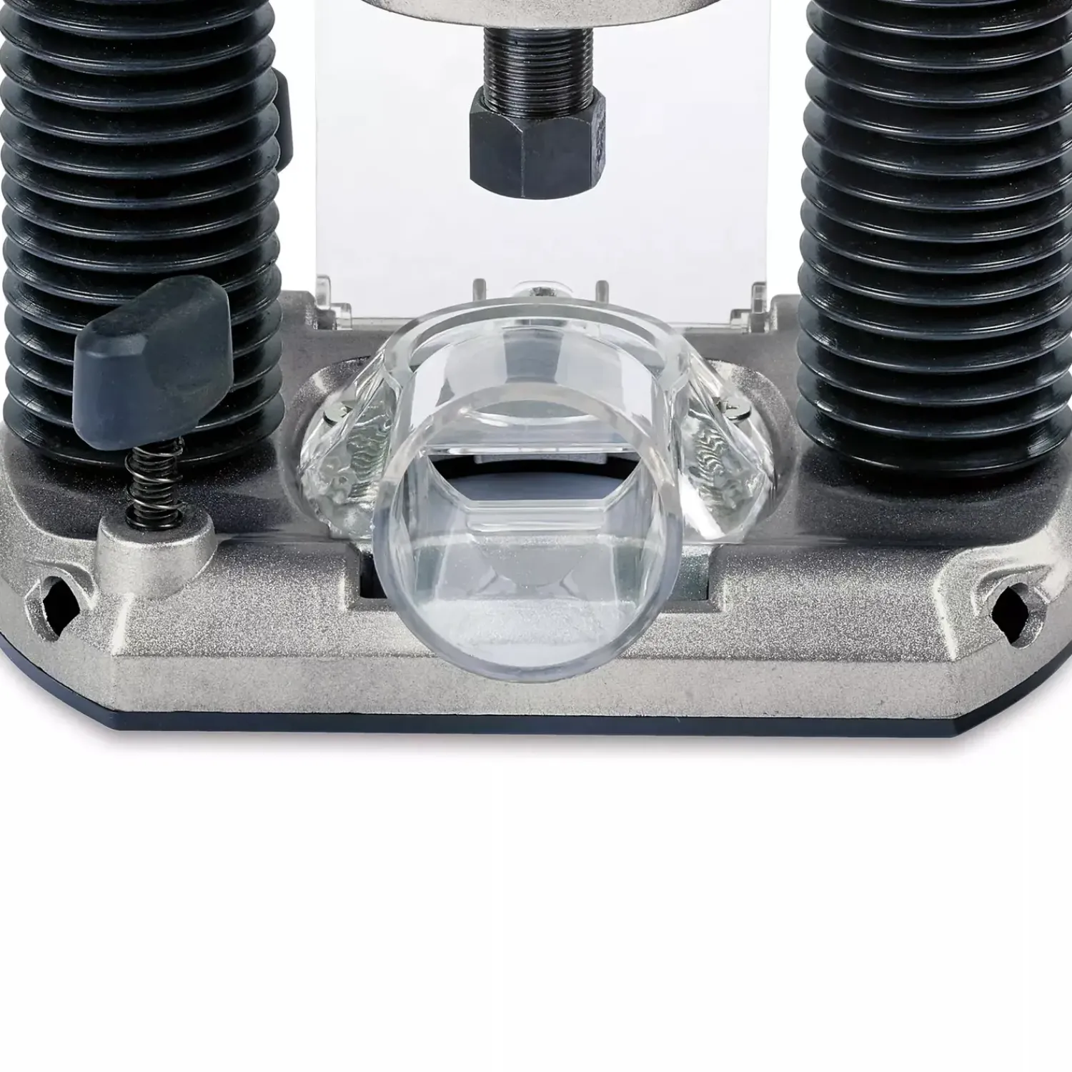 En spånskærm giver yderligere sikkerhed under arbejdet. Den elektroniske hastighedsregulering gør det muligt at tilpasse overfræseren optimalt i forhold til arbejdsemnet og fræsejernet. Det velafbalancerede design gør overfræseren meget stabil i brug, og spindellåsen sørger for, at fræsejernet hurtigt kan skiftes.