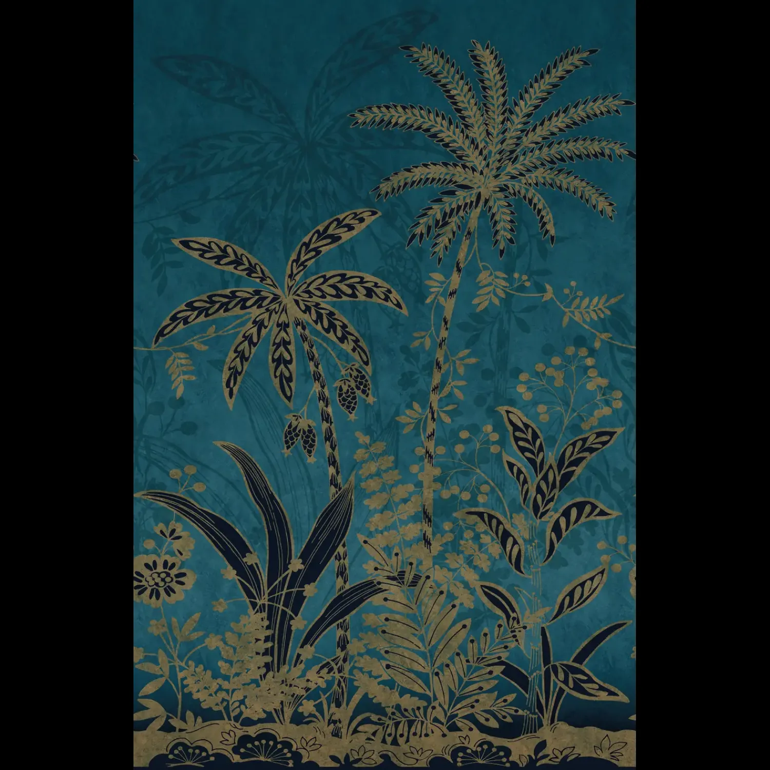 Et stormønstret palmetapet med store, kraftige palmeblade i forgrunden, og mere afdæmpede blade i baggrunden. De forskellige lag i mønstret skaber en imponerende dybde på tapetets overflade.