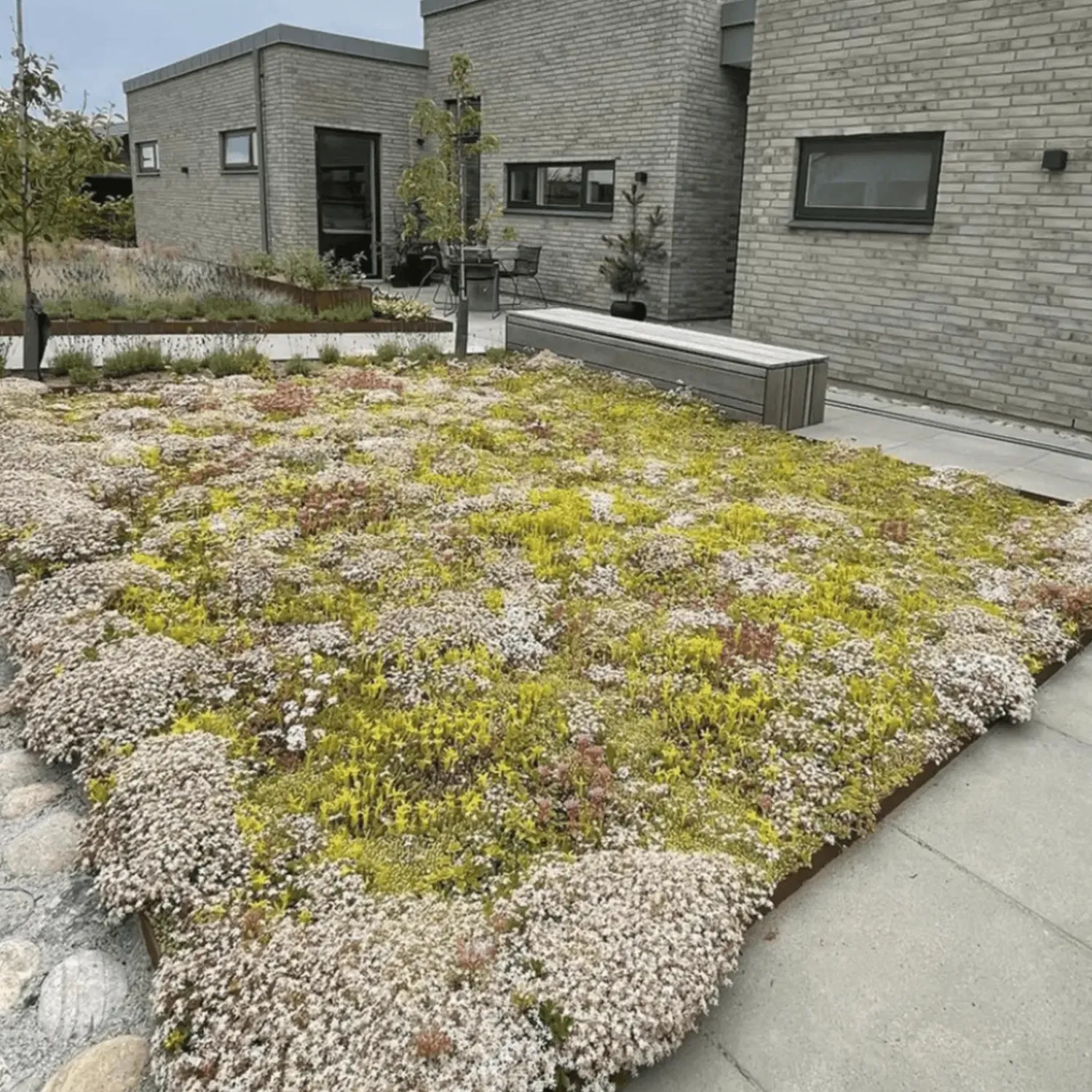 Med vores sedummåtter, gør vi det nemt og hurtigt, at få en flot have, uden store vedligeholdelsesomkostninger. Måtterne består udelukkende af sedumplanter, som er en hårdfør tørkeresistent plante. Planterne gror mellem 5 -10 cm afhængig af årstiden vi er i. Det smarte ved dette, er at planterne ikke gror ligeså højt som græs eksempelvis. Vi anbefaler at vande sedummåtterne i varme sæsoner hvor der ikke falder regn.